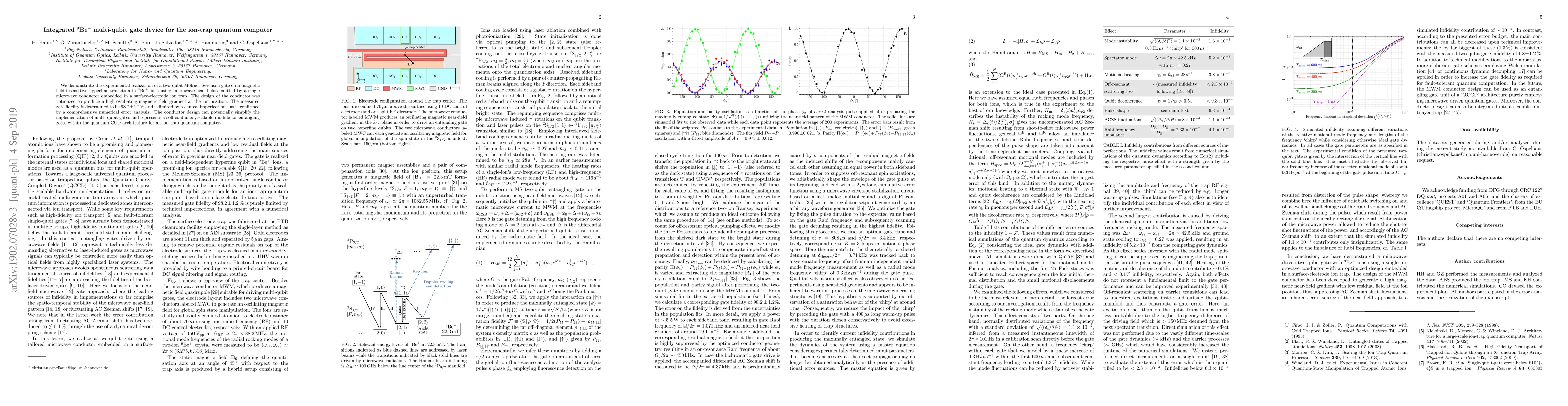 We demonstrate the experimental realization of a two-qubit M{\o}lmer-S{\o}rensen gate on a magnetic field-insensitive hyperfine transition in $^9$Be$^+$ ions using microwave-near fields emitted by a single microwave conductor embedded in a surface-electrode ion trap. The design of the conductor was optimized to produce a high oscillating magnetic field gradient at the ion position. The measured gate fidelity is determined to be $98.2\pm1.2\,\%$ and is limited by technical imperfections, as is confirmed by a comprehensive numerical error analysis. The conductor design can potentially simplify the implementation of multi-qubit gates and represents a self-contained, scalable module for entangling gates within the quantum CCD architecture for an ion-trap quantum computer.