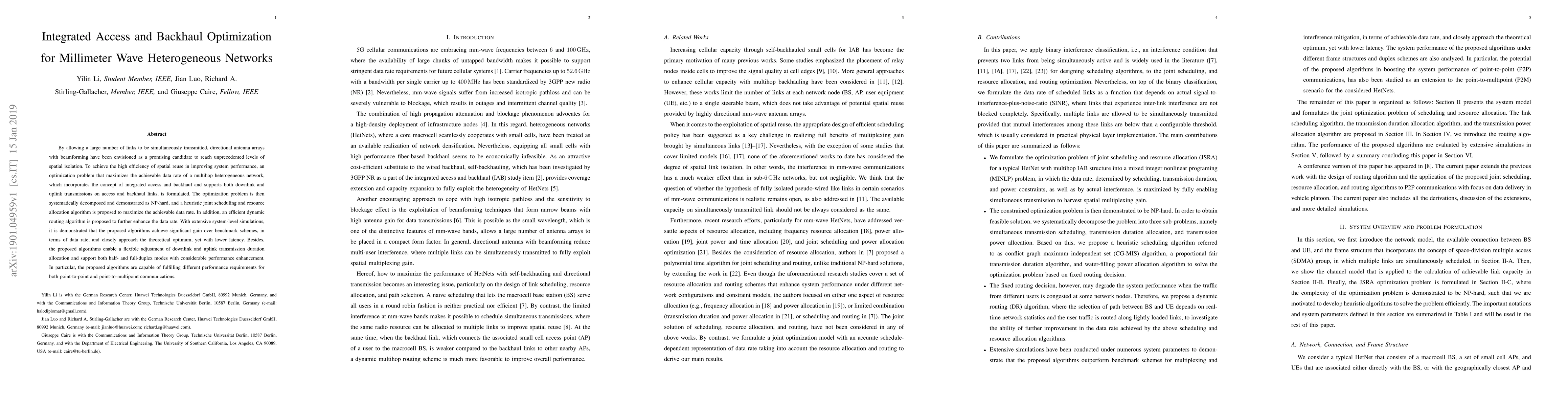 By allowing a large number of links to be simultaneously transmitted, directional antenna arrays with beamforming have been envisioned as a promising candidate to reach unprecedented levels of spatial isolation. To achieve the high efficiency of spatial reuse in improving system performance, an optimization problem that maximizes the achievable data rate of a multihop heterogeneous network, which incorporates the concept of integrated access and backhaul and supports both downlink and uplink transmissions on access and backhaul links, is formulated. The optimization problem is then systematically decomposed and demonstrated as NP-hard, and a heuristic joint scheduling and resource allocation algorithm is proposed to maximize the achievable data rate. In addition, an efficient dynamic routing algorithm is proposed to further enhance the data rate. With extensive system-level simulations, it is demonstrated that the proposed algorithms achieve significant gain over benchmark schemes, in terms of data rate, and closely approach the theoretical optimum, yet with lower latency. Besides, the proposed algorithms enable a flexible adjustment of downlink and uplink transmission duration allocation and support both half- and full-duplex modes with considerable performance enhancement. In particular, the proposed algorithms are capable of fulfilling different performance requirements for both point-to-point and point-to-multipoint communications.