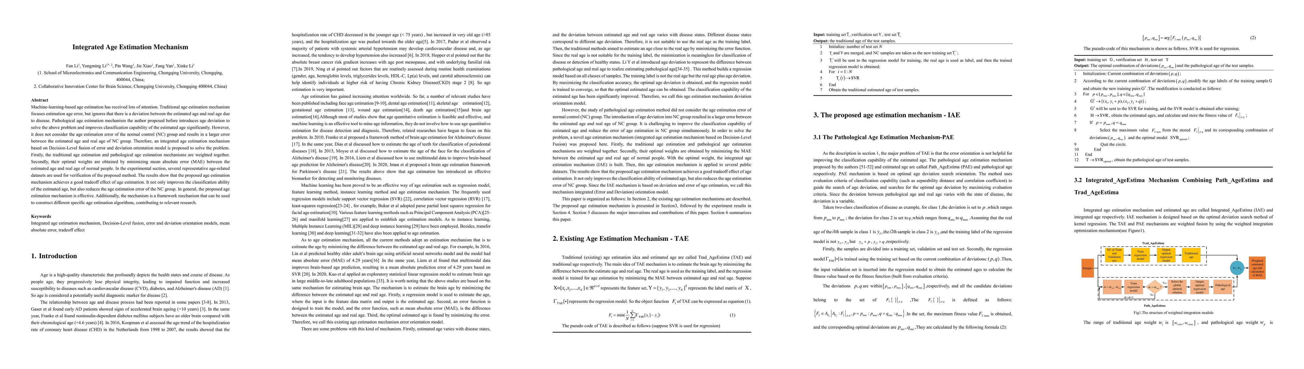 The research proposes an integrated age estimation mechanism that combines traditional and pathological age estimation models, addressing their individual shortcomings. By optimally weighting these models and minimizing mean absolute error for the normal control group, the new method enhances age estimation accuracy while reducing errors for this group, demonstrated through experiments on various age-related datasets. This framework can be adapted for diverse age estimation algorithms.