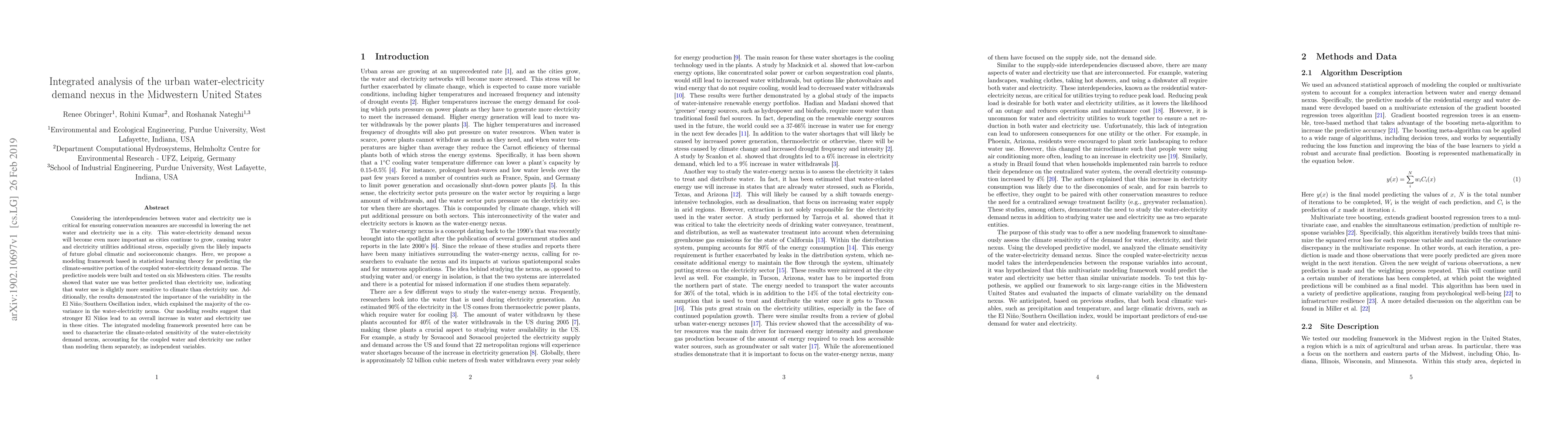 This study develops a statistical modeling framework to predict the climate-sensitive water-electricity demand nexus in six Midwestern U.S. cities, finding that water use is more climate-sensitive than electricity use, with El Nino/Southern Oscillation variability significantly influencing their interdependency.