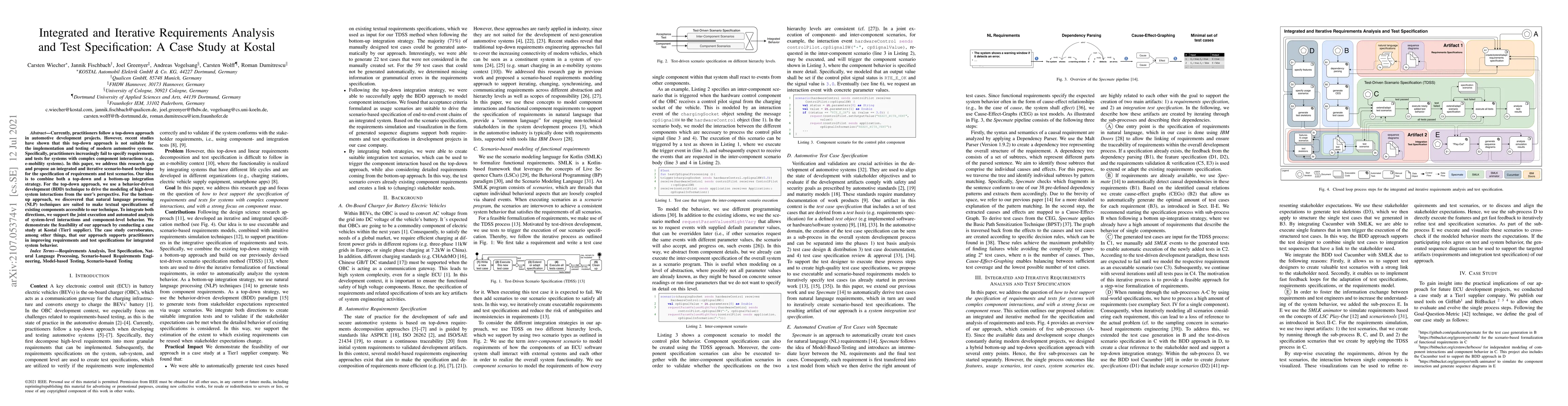 This paper proposes an integrated and iterative scenario-based technique for automotive requirements and test specification, combining top-down BDD and bottom-up NLP methods. A case study at Kostal demonstrates its effectiveness in improving specifications for complex systems.