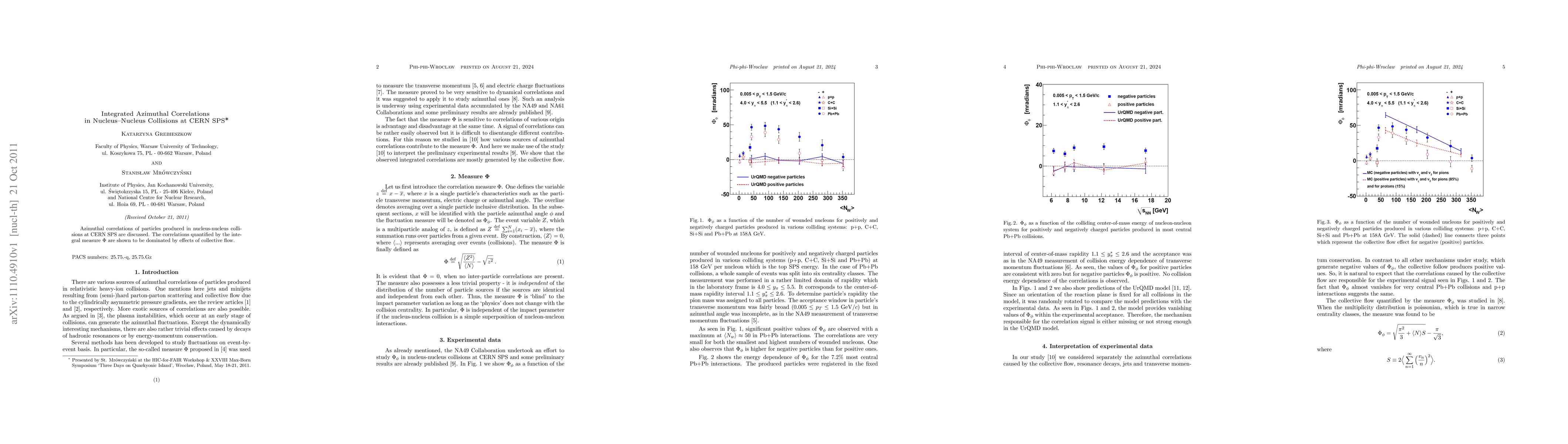 Summary: Research investigates azimuthal correlations in nucleus-nucleus collisions at CERN SPS, finding that the integral measure Phi primarily reflects collective flow effects rather than other factors. This suggests a dominant role of collective dynamics in the observed correlations.