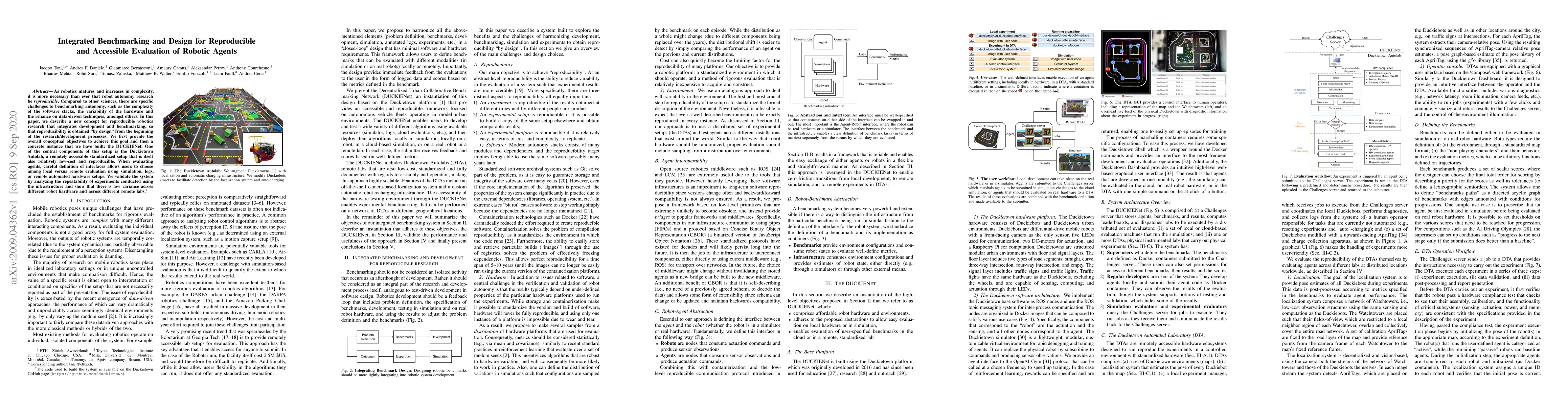 As robotics matures and increases in complexity, it is more necessary than ever that robot autonomy research be reproducible. Compared to other sciences, there are specific challenges to benchmarking autonomy, such as the complexity of the software stacks, the variability of the hardware and the reliance on data-driven techniques, amongst others. In this paper, we describe a new concept for reproducible robotics research that integrates development and benchmarking, so that reproducibility is obtained "by design" from the beginning of the research/development processes. We first provide the overall conceptual objectives to achieve this goal and then a concrete instance that we have built: the DUCKIENet. One of the central components of this setup is the Duckietown Autolab, a remotely accessible standardized setup that is itself also relatively low-cost and reproducible. When evaluating agents, careful definition of interfaces allows users to choose among local versus remote evaluation using simulation, logs, or remote automated hardware setups. We validate the system by analyzing the repeatability of experiments conducted using the infrastructure and show that there is low variance across different robot hardware and across different remote labs.