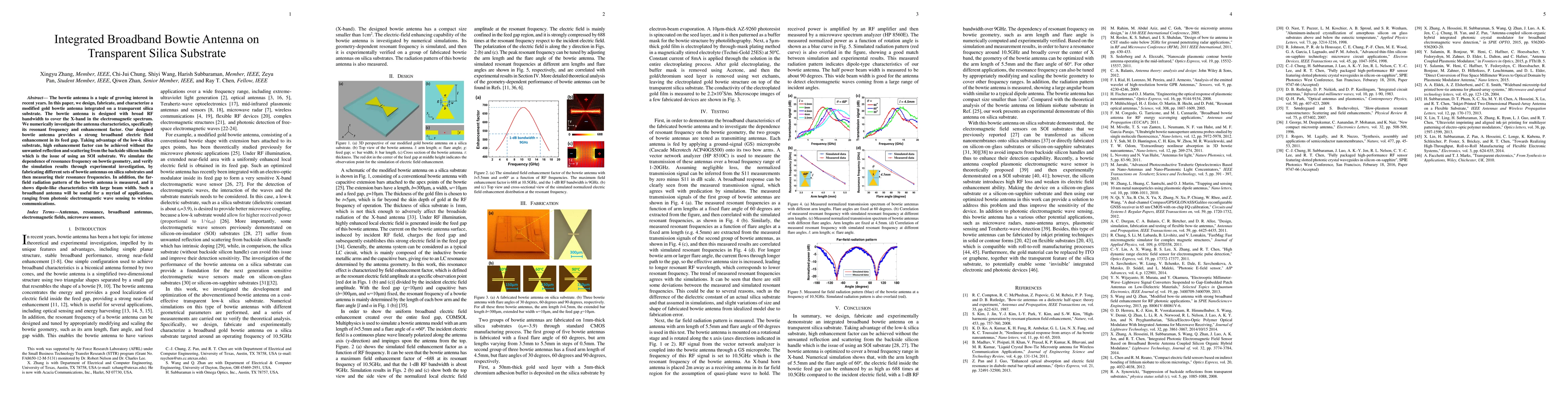 This paper presents a modified gold bowtie antenna integrated on a transparent silica substrate, designed for broad RF bandwidth covering the X-band. The antenna exhibits significant broadband electric field enhancement and a dipole-like radiation pattern, with the silica substrate minimizing unwanted reflections compared to SOI substrates.