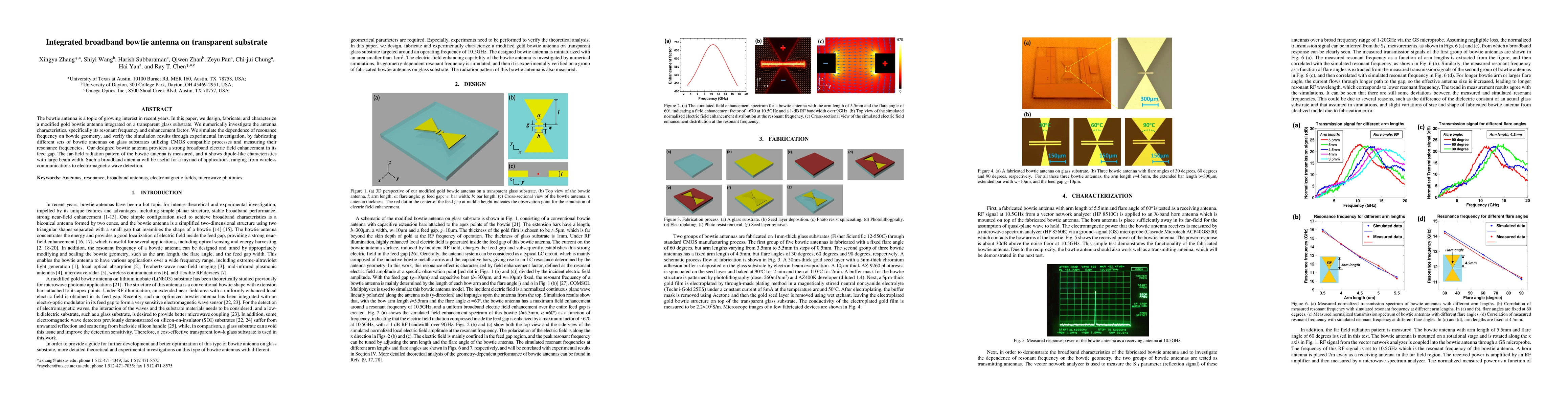 This research presents a modified gold bowtie antenna integrated on a transparent glass substrate, characterized by broadband electric field enhancement and dipole-like far-field radiation patterns. Numerical and experimental investigations confirm its resonant frequency and geometric dependency, demonstrating its potential for wireless communications and electromagnetic detection.