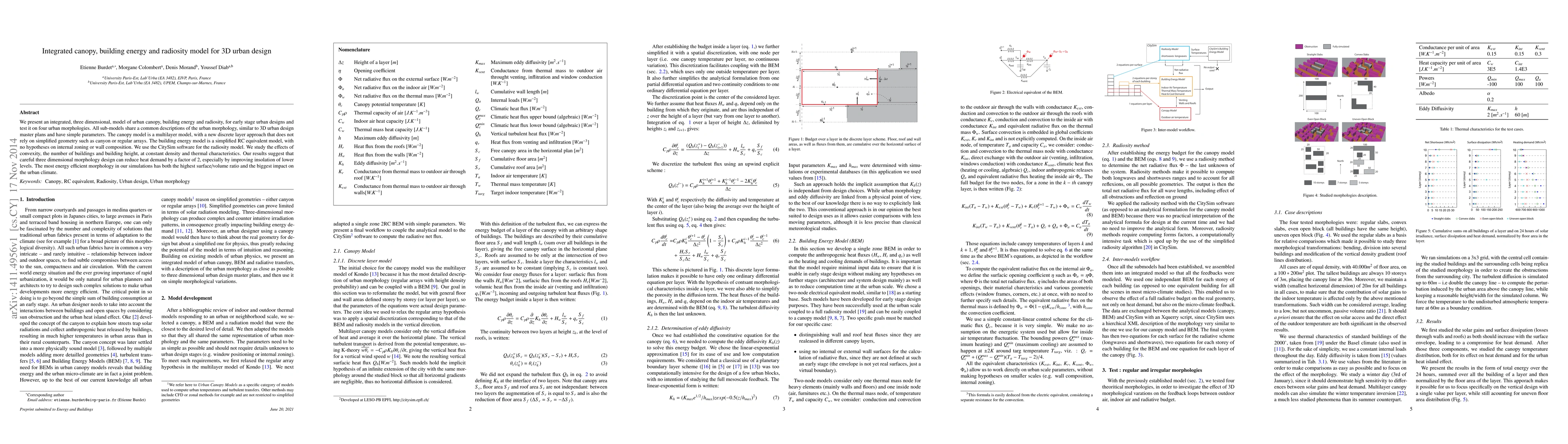 We present an integrated, three dimensional, model of urban canopy, building energy and radiosity, for early stage urban designs and test it on four urban morphologies. All sub-models share a common descriptions of the urban morphology, similar to 3D urban design master plans and have simple parameters. The canopy model is a multilayer model, with a new discrete layer approach that does not rely on simplified geometry such as canyon or regular arrays. The building energy model is a simplified RC equivalent model, with no hypotheses on internal zoning or wall composition. We use the CitySim software for the radiosity model. We study the effects of convexity, the number of buildings and building height, at constant density and thermal characteristics. Our results suggest that careful three dimensional morphology design can reduce heat demand by a factor of 2, especially by improving insolation of lower levels. The most energy efficient morphology in our simulations has both the highest surface/volume ratio and the biggest impact on the urban climate.