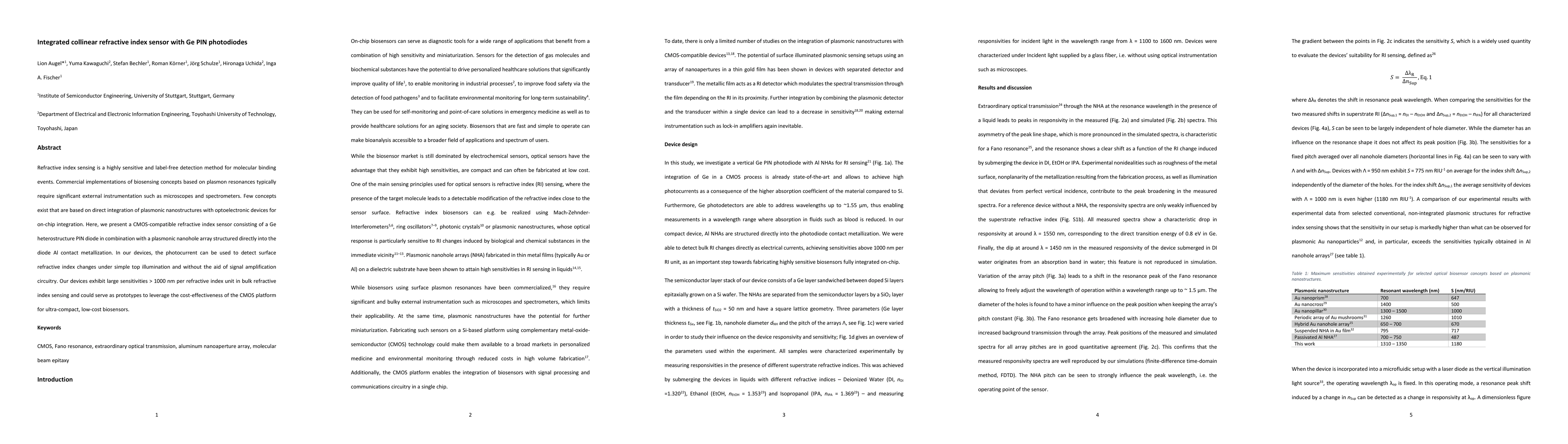 This paper introduces a CMOS-compatible refractive index sensor using a Ge heterostructure PIN diode integrated with a plasmonic nanohole array, enabling label-free detection without external instrumentation. The device shows high sensitivity and potential for cost-effective, compact biosensing applications.
