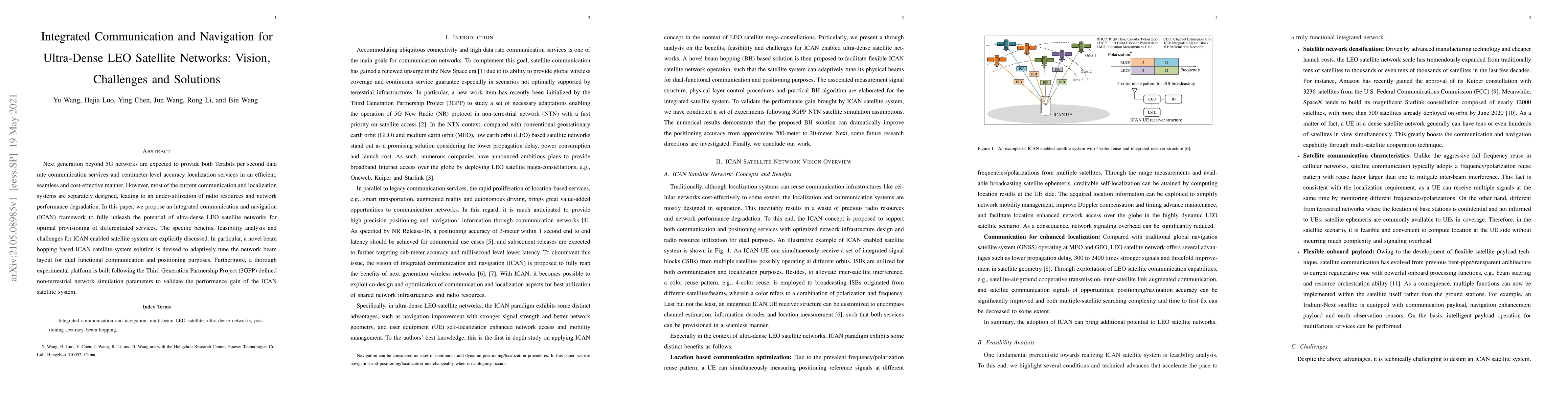 This paper proposes an integrated communication and navigation (ICAN) framework for ultra-dense LEO satellite networks to optimize both communication and localization services. The study introduces a novel beam hopping-based solution to adaptively manage network beams for dual purposes, validated through a 3GPP-compliant experimental platform.