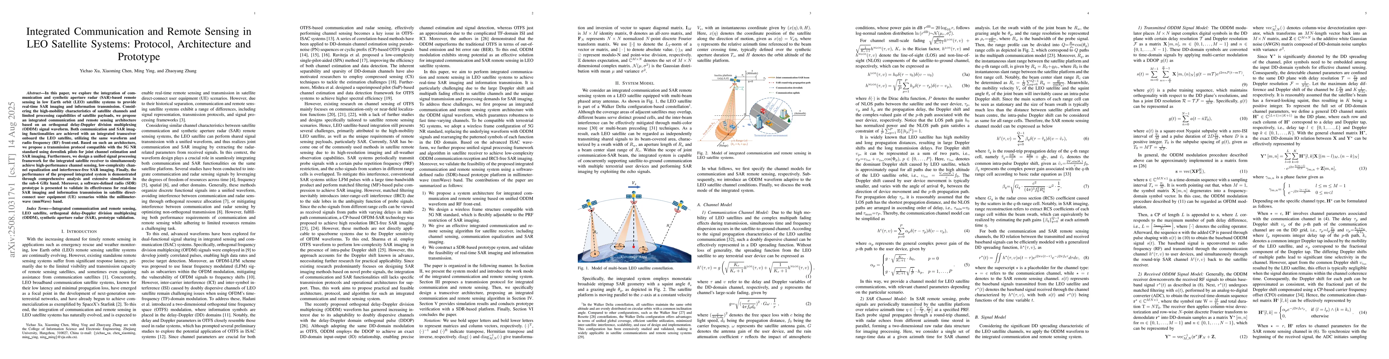 In this paper, we explore the integration of communication and synthetic aperture radar (SAR)-based remote sensing in low Earth orbit (LEO) satellite systems to provide real-time SAR imaging and information transmission. Considering the high-mobility characteristics of satellite channels and limited processing capabilities of satellite payloads, we propose an integrated communication and remote sensing architecture based on an orthogonal delay-Doppler division multiplexing (ODDM) signal waveform. Both communication and SAR imaging functionalities are achieved with an integrated transceiver onboard the LEO satellite, utilizing the same waveform and radio frequency (RF) front-end. Based on such an architecture, we propose a transmission protocol compatible with the 5G NR standard using downlink pilots for joint channel estimation and SAR imaging. Furthermore, we design a unified signal processing framework for the integrated satellite receiver to simultaneously achieve high-performance channel sensing, low-complexity channel equalization and interference-free SAR imaging. Finally, the performance of the proposed integrated system is demonstrated through comprehensive analysis and extensive simulations in the sub-6 GHz band. Moreover, a software-defined radio (SDR) prototype is presented to validate its effectiveness for real-time SAR imaging and information transmission in satellite direct-connect user equipment (UE) scenarios within the millimeter-wave (mmWave) band.