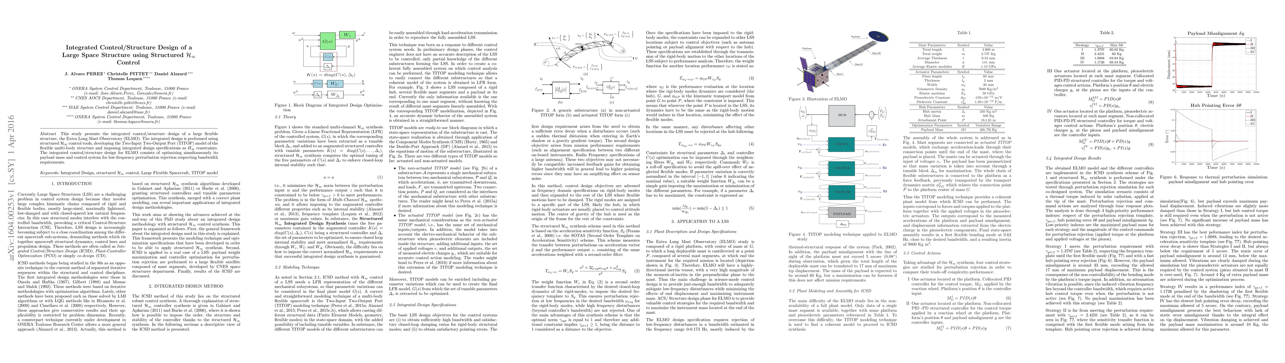 Researchers developed an integrated control/structure design for a large space structure called the Extra Long Mast Observatory (ELMO) using structured $ extit{H}_ extinfty$ control tools. The study optimized payload mass and control system simultaneously to achieve low-frequency perturbation rejection while respecting bandwidth requirements.