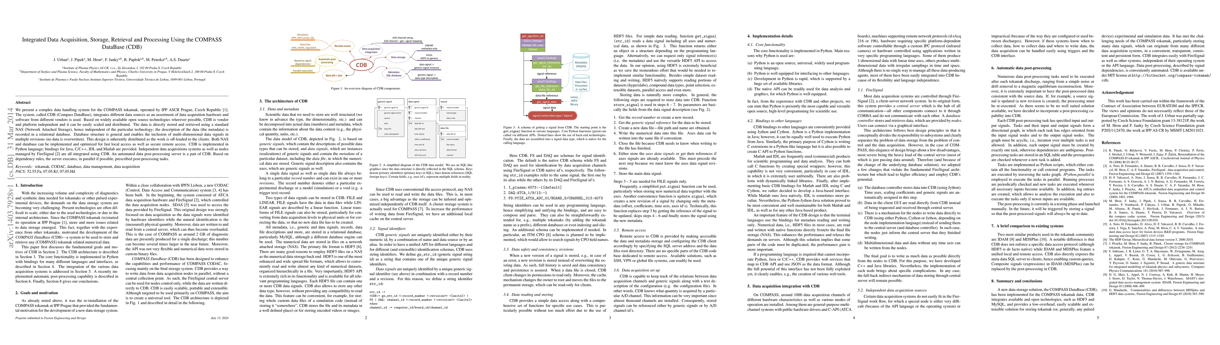 The COMPASS DataBase (CDB) integrates data acquisition, storage, retrieval, and processing for the COMPASS tokamak, utilizing open-source technologies for vendor and platform independence. It employs a Network Attached Storage for data storage and a relational database for metadata, supporting multi-dimensional data signals and distributed processing.