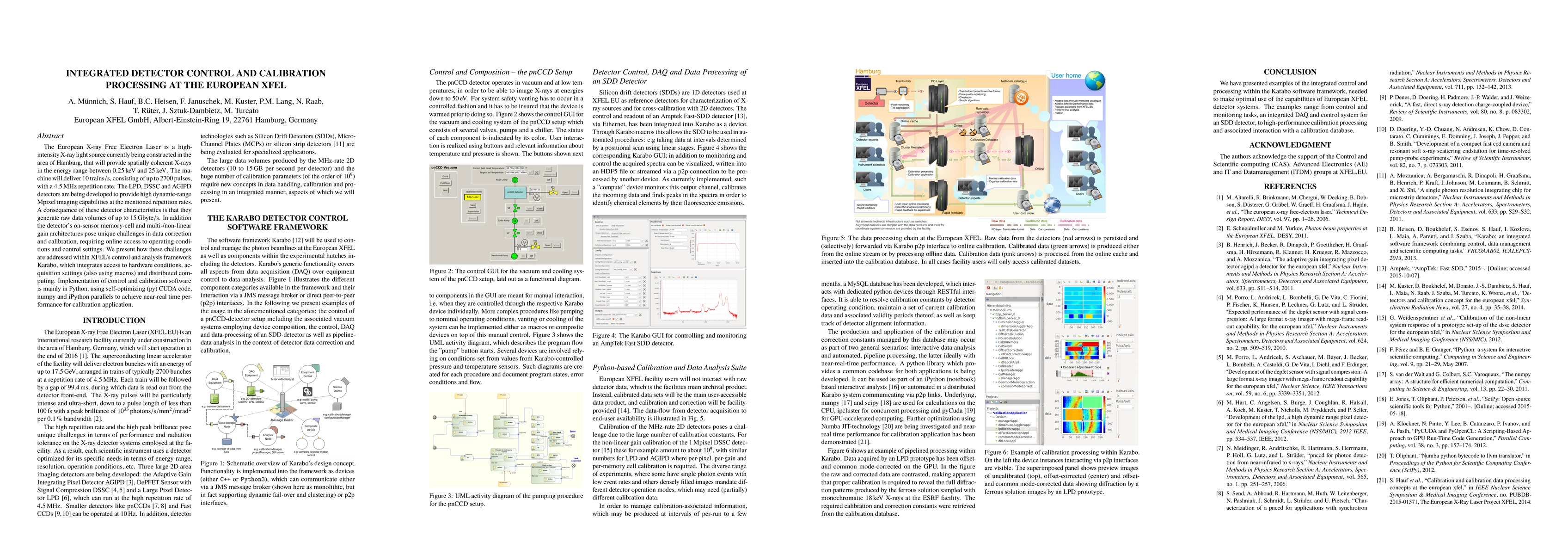 The European X-ray Free Electron Laser is a high-intensity X-ray light source currently being constructed in the area of Hamburg, that will provide spatially coherent X-rays in the energy range between $0.25\,\mathrm{keV}$ and $25\,\mathrm{keV}$. The machine will deliver $10\,\mathrm{trains/s}$, consisting of up to $2700\,\mathrm{pulses}$, with a $4.5\,\mathrm{MHz}$ repetition rate. The LPD, DSSC and AGIPD detectors are being developed to provide high dynamic-range Mpixel imaging capabilities at the mentioned repetition rates. A consequence of these detector characteristics is that they generate raw data volumes of up to $15\,\mathrm{Gbyte/s}$. In addition the detector's on-sensor memory-cell and multi-/non-linear gain architectures pose unique challenges in data correction and calibration, requiring online access to operating conditions and control settings. We present how these challenges are addressed within XFEL's control and analysis framework Karabo, which integrates access to hardware conditions, acquisition settings (also using macros) and distributed computing. Implementation of control and calibration software is mainly in Python, using self-optimizing (py) CUDA code, numpy and iPython parallels to achieve near-real time performance for calibration application.
