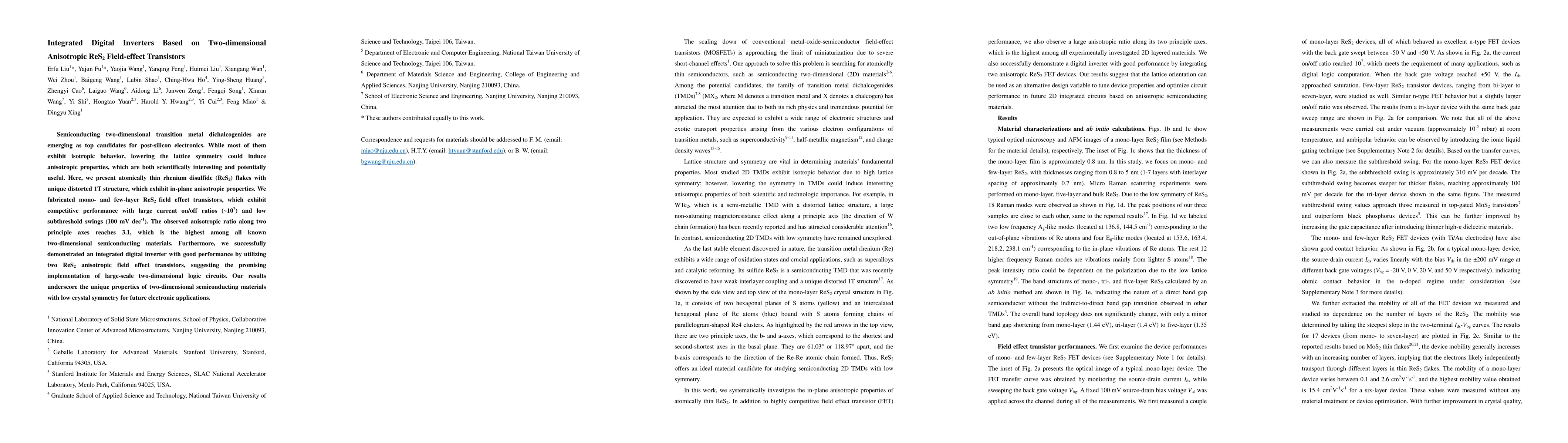 This paper presents rhenium disulfide (ReS2) flakes with anisotropic properties, fabricated into field-effect transistors (FETs) showing high performance and significant anisotropy. The study demonstrates an integrated digital inverter using ReS2 FETs, highlighting the potential for large-scale 2D logic circuits.