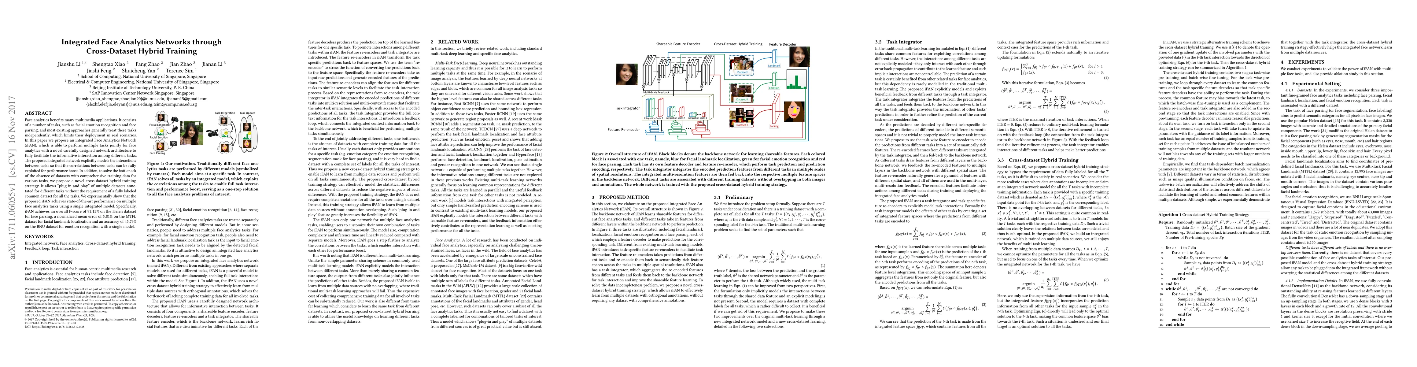 This paper proposes an integrated Face Analytics Network (iFAN) that performs multiple face analytics tasks jointly, leveraging a novel network architecture to enhance inter-task interactions. It introduces a cross-dataset hybrid training strategy to utilize diverse datasets without requiring a fully labeled common dataset, achieving state-of-the-art performance on face parsing, facial landmark localization, and emotion recognition.