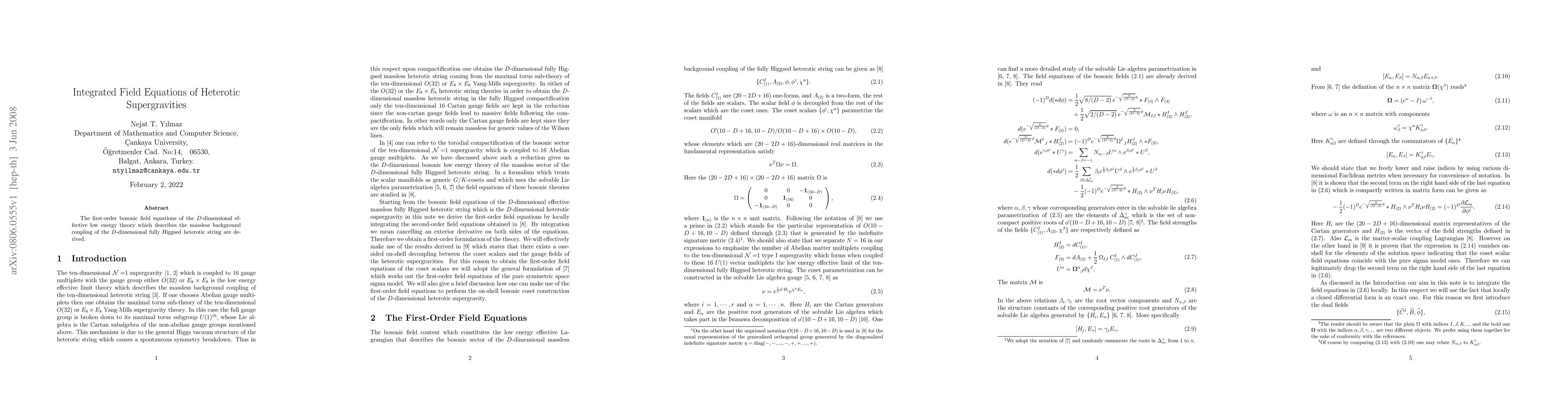 The first-order bosonic field equations of the D-dimensional effective low energy theory which describes the massless background coupling of the D-dimensional fully Higgsed heterotic string are derived.