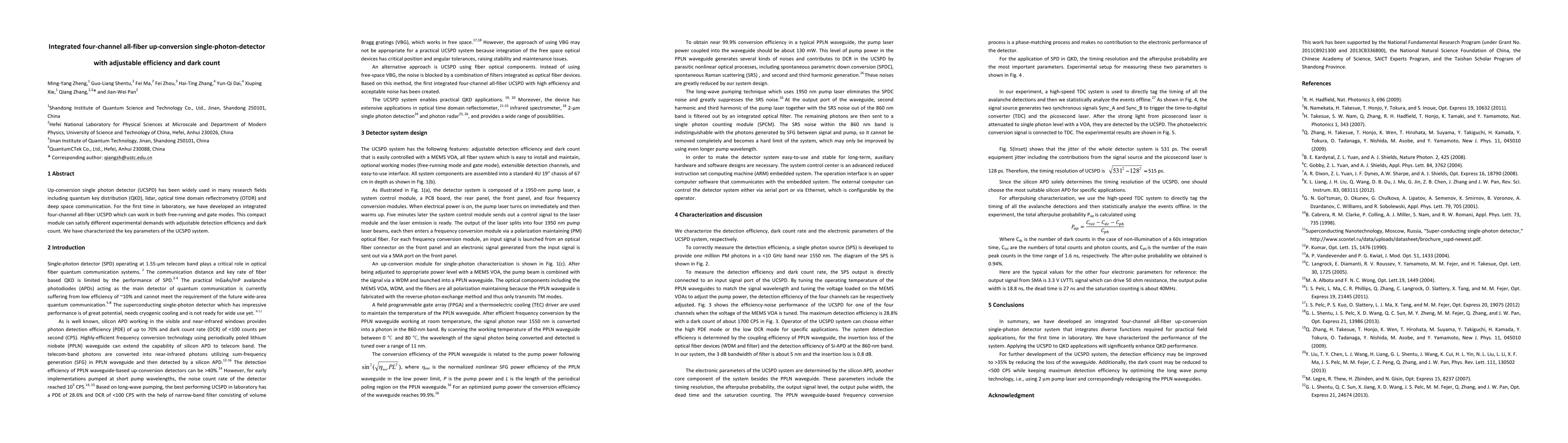 This research presents an integrated four-channel all-fiber up-conversion single-photon detector (UCSPD) with adjustable efficiency and dark count, suitable for applications like quantum key distribution and lidar. The developed compact module can operate in both free-running and gate modes, meeting diverse experimental requirements.