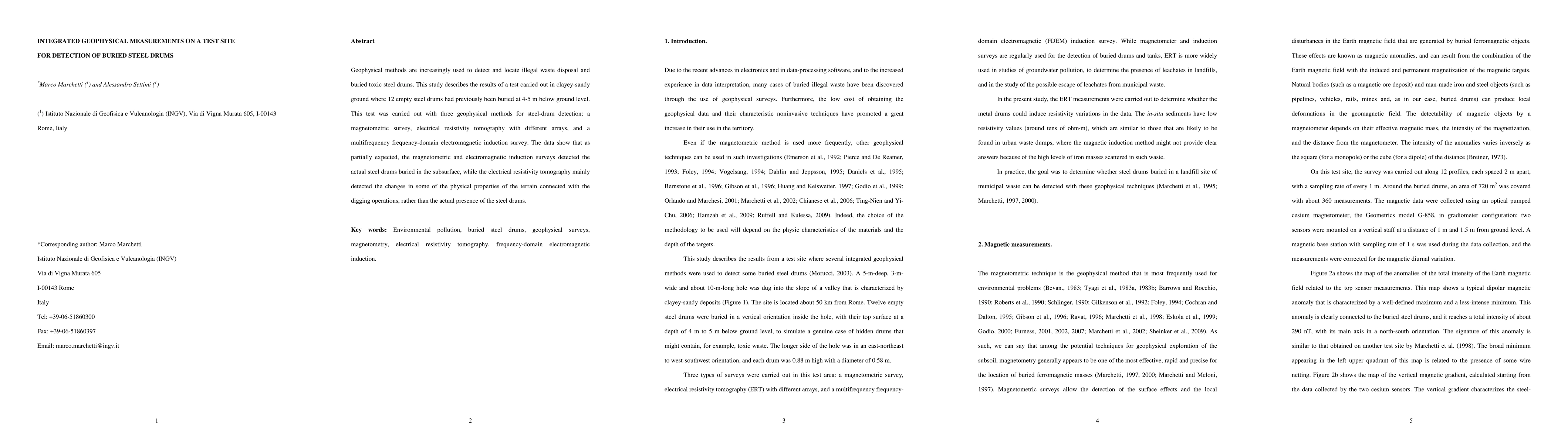 Geophysical methods are increasingly used to detect and locate illegal waste disposal and buried toxic steel drums. This study describes the results of a test carried out in clayey-sandy ground where 12 empty steel drums had previously been buried at 4-5 m below ground level. This test was carried out with three geophysical methods for steel-drum detection: a magnetometric survey, electrical resistivity tomography with different arrays, and a multifrequency frequency-domain electromagnetic induction survey. The data show that as partially expected, the magnetometric and electromagnetic induction surveys detected the actual steel drums buried in the subsurface, while the electrical resistivity tomography mainly detected the changes in some of the physical properties of the terrain connected with the digging operations, rather than the actual presence of the steel drums.