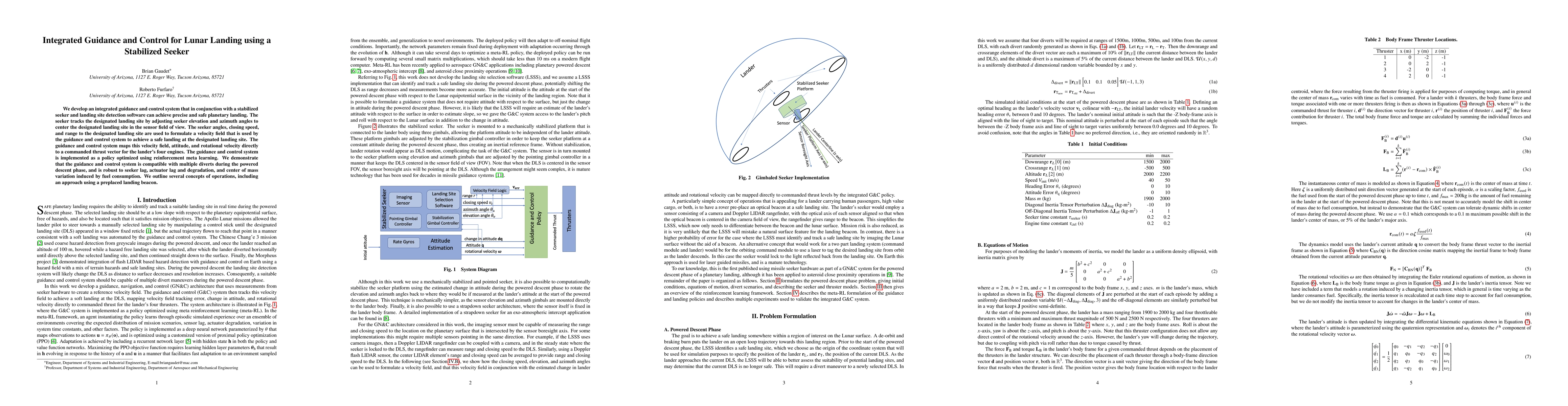This paper presents an integrated guidance and control system for precise lunar landing, utilizing a stabilized seeker and reinforcement meta learning to optimize performance. The system effectively handles multiple diverts and is robust against various operational challenges.