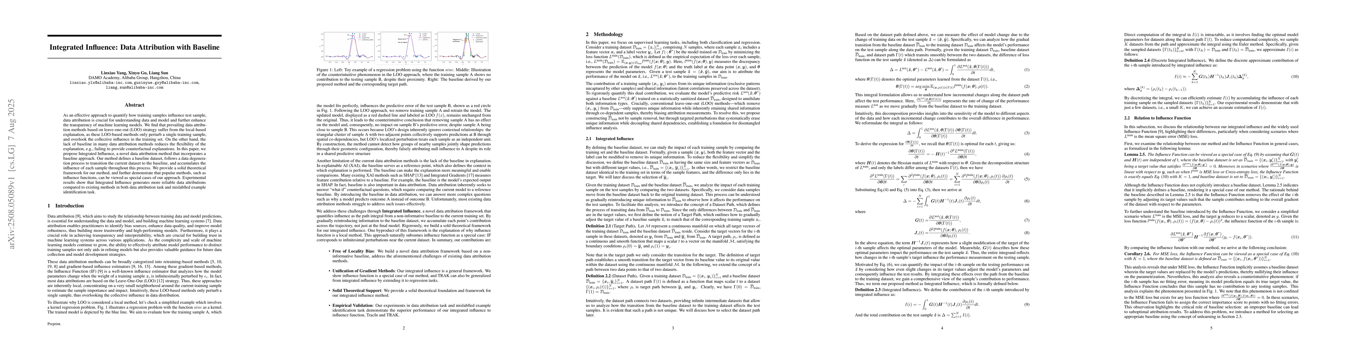 As an effective approach to quantify how training samples influence test sample, data attribution is crucial for understanding data and model and further enhance the transparency of machine learning models. We find that prevailing data attribution methods based on leave-one-out (LOO) strategy suffer from the local-based explanation, as these LOO-based methods only perturb a single training sample, and overlook the collective influence in the training set. On the other hand, the lack of baseline in many data attribution methods reduces the flexibility of the explanation, e.g., failing to provide counterfactual explanations. In this paper, we propose Integrated Influence, a novel data attribution method that incorporates a baseline approach. Our method defines a baseline dataset, follows a data degeneration process to transition the current dataset to the baseline, and accumulates the influence of each sample throughout this process. We provide a solid theoretical framework for our method, and further demonstrate that popular methods, such as influence functions, can be viewed as special cases of our approach. Experimental results show that Integrated Influence generates more reliable data attributions compared to existing methods in both data attribution task and mislablled example identification task.