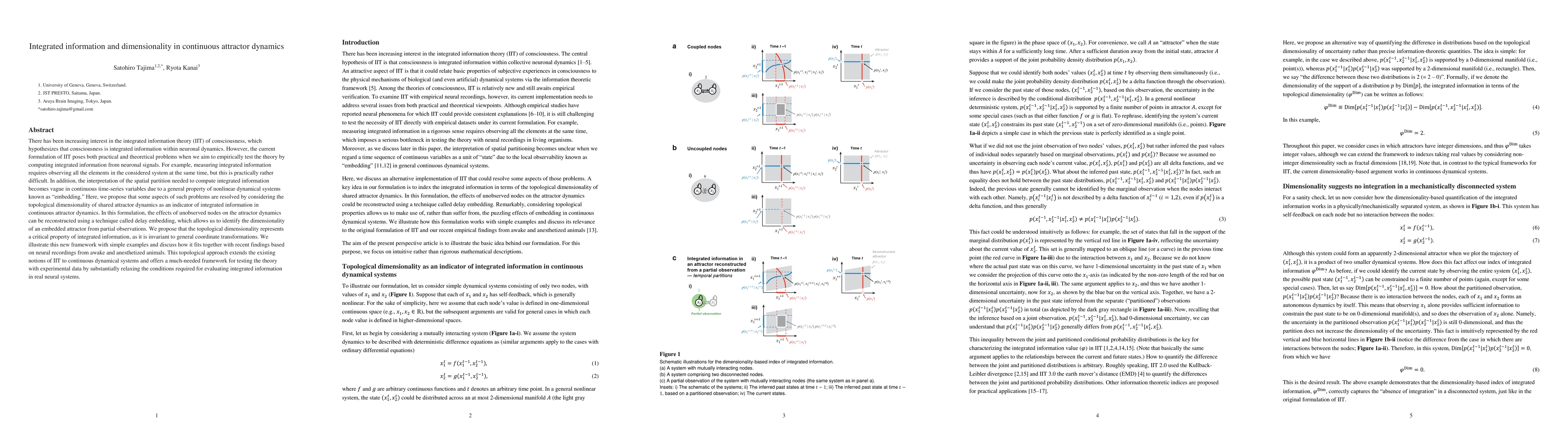 There has been increasing interest in the integrated information theory (IIT) ofconsciousness, which hypothesizes that consciousness is integrated information withinneuronal dynamics. However, the current formulation of IIT poses both practical andtheoretical problems when we aim to empirically test the theory by computingintegrated information from neuronal signals. For example, measuring integratedinformation requires observing all the elements in the considered system at the sametime, but this is practically rather difficult. In addition, the interpretation of the spatialpartition needed to compute integrated information becomes vague in continuous time-series variables due to a general property of nonlinear dynamical systems known as"embedding." Here, we propose that some aspects of such problems are resolved byconsidering the topological dimensionality of shared attractor dynamics as an indicatorof integrated information in continuous attractor dynamics. In this formulation, theeffects of unobserved nodes on the attractor dynamics can be reconstructed using atechnique called delay embedding, which allows us to identify the dimensionality of anembedded attractor from partial observations. We propose that the topologicaldimensionality represents a critical property of integrated information, as it is invariantto general coordinate transformations. We illustrate this new framework with simpleexamples and discuss how it fits together with recent findings based on neuralrecordings from awake and anesthetized animals. This topological approach extendsthe existing notions of IIT to continuous dynamical systems and offers a much-neededframework for testing the theory with experimental data by substantially relaxing theconditions required for evaluating integrated information in real neural systems.