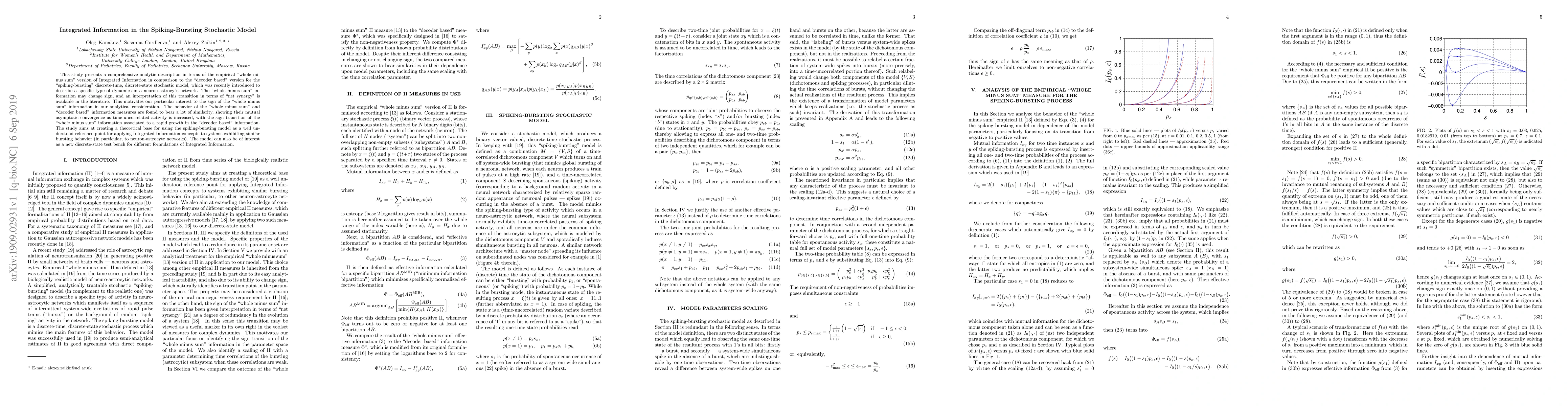 This study analytically compares two versions of Integrated Information in the spiking-bursting stochastic model, finding their asymptotic convergence and a sign transition in "whole minus sum" information linked to a rapid increase in "decoder based" information. The aim is to establish a theoretical foundation for applying Integrated Information concepts to neuron-astrocyte networks and other systems with similar dynamics.