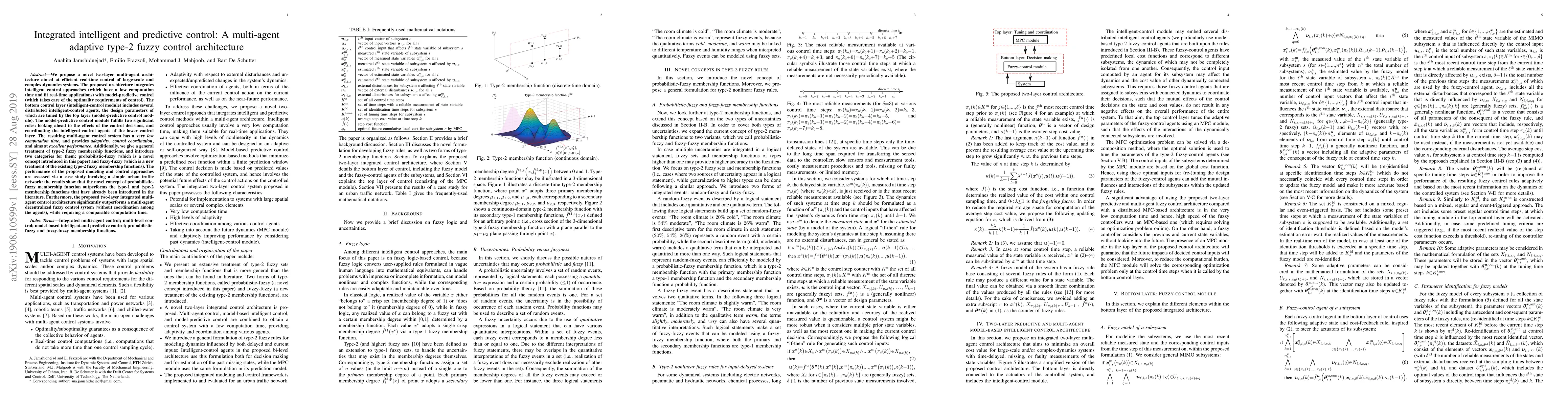 We propose a novel two-layer multi-agent architecture aimed at efficient real-time control of large-scale and complex-dynamics systems. The proposed architecture integrates intelligent control approaches (which have a low computation time and fit real-time applications) with model-predictive control (which takes care of the optimality requirements of control). The bottom control layer (intelligent-control module) includes several distributed intelligent-control agents, the design parameters of which are tuned by the top layer (model-predictive control module). The model-predictive control module fulfills two significant roles: looking ahead to the effects of the control decisions, and coordinating the intelligent-control agents of the lower control layer. The resulting multi-agent control system has a very low computation time, and provides adaptivity, control coordination, and aims at excellent performance. Additionally, we give a general treatment of type-2 fuzzy membership functions, and introduce two categories for them: probabilistic-fuzzy (which is a novel concept introduced in this paper) and fuzzy-fuzzy (which is a new treatment of the existing type-2 fuzzy membership functions). The performance of the proposed modeling and control approaches are assessed via a case study involving a simple urban traffic network: the results show that the novel concept of probabilistic-fuzzy membership function outperforms the type-1 and type-2 membership functions that have already been introduced in the literature. Furthermore, the proposed two-layer integrated multi-agent control architecture significantly outperforms a multi-agent decentralized fuzzy control system (without coordination among the agents), while requiring a comparable computation time.