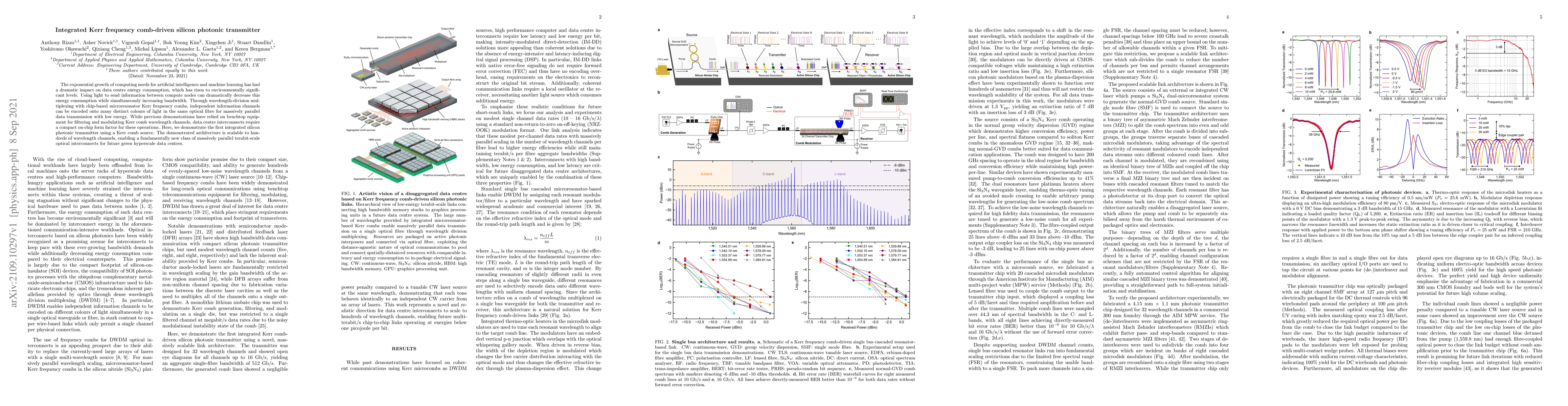 This paper presents an integrated silicon photonic transmitter driven by a Kerr frequency comb, aiming to reduce data centre energy consumption for AI and machine learning. It introduces a scalable solution for massively parallel terabit-scale optical interconnects, facilitating efficient and low-energy data transmission.