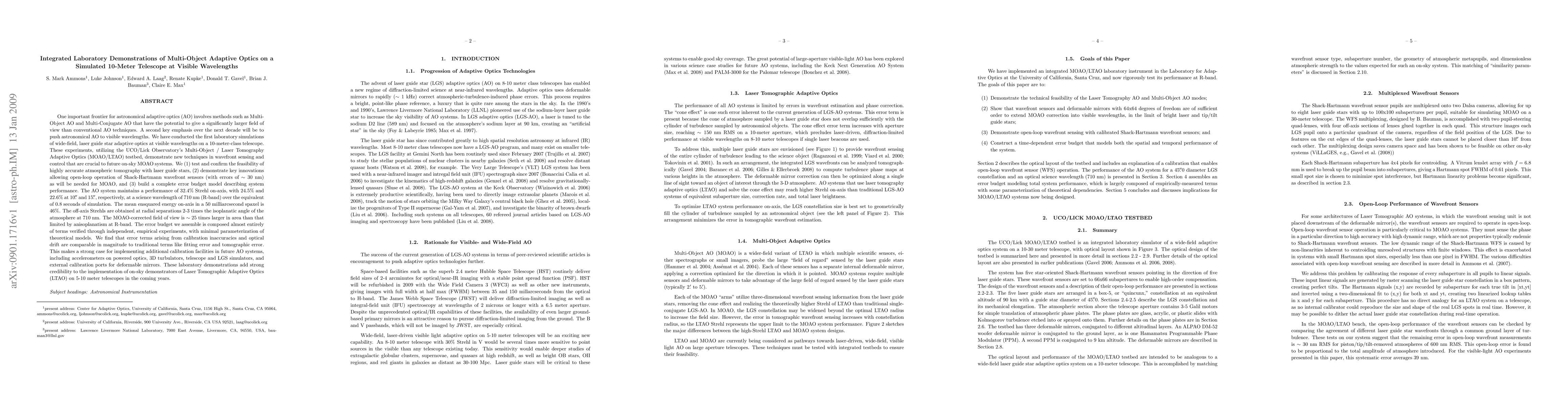 This paper presents laboratory simulations of Multi-Object Adaptive Optics (MOAO) on a simulated 10-meter telescope at visible wavelengths, demonstrating significant improvements in field of view over conventional AO techniques. The study confirms the feasibility of atmospheric tomography and showcases innovations in wavefront sensing, achieving a 32.4% Strehl ratio on-axis and a 25-fold larger corrected field of view, highlighting the need for enhanced calibration facilities in future AO systems.