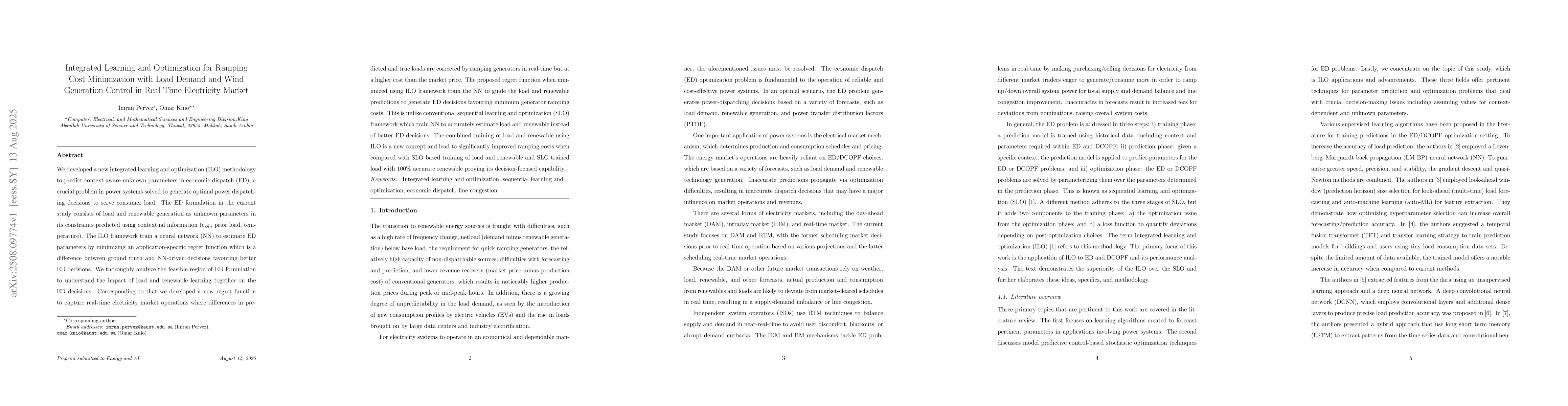 We developed a new integrated learning and optimization (ILO) methodology to predict context-aware unknown parameters in economic dispatch (ED), a crucial problem in power systems solved to generate optimal power dispatching decisions to serve consumer load. The ED formulation in the current study consists of load and renewable generation as unknown parameters in its constraints predicted using contextual information (e.g., prior load, temperature). The ILO framework train a neural network (NN) to estimate ED parameters by minimizing an application-specific regret function which is a difference between ground truth and NN-driven decisions favouring better ED decisions. We thoroughly analyze the feasible region of ED formulation to understand the impact of load and renewable learning together on the ED decisions. Corresponding to that we developed a new regret function to capture real-time electricity market operations where differences in predicted and true loads are corrected by ramping generators in real-time but at a higher cost than the market price. The proposed regret function when minimized using ILO framework train the NN to guide the load and renewable predictions to generate ED decisions favouring minimum generator ramping costs. This is unlike conventional sequential learning and optimization (SLO) framework which train NN to accurately estimate load and renewable instead of better ED decisions. The combined training of load and renewable using ILO is a new concept and lead to significantly improved ramping costs when compared with SLO based training of load and renewable and SLO trained load with 100% accurate renewable proving its decision-focused capability.