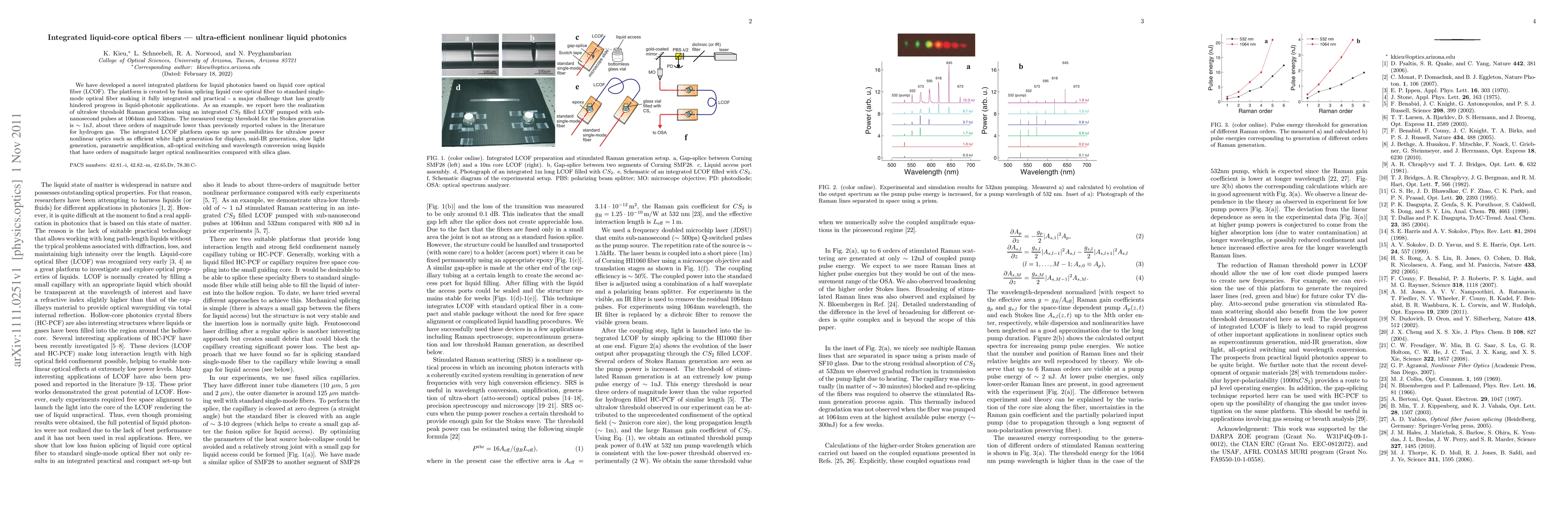 We have developed a novel integrated platform for liquid photonics based on liquid core optical fiber (LCOF). The platform is created by fusion splicing liquid core optical fiber to standard single-mode optical fiber making it fully integrated and practical - a major challenge that has greatly hindered progress in liquid-photonic applications. As an example, we report here the realization of ultralow threshold Raman generation using an integrated CS2 filled LCOF pumped with sub-nanosecond pulses at 1064nm and 532nm. The measured energy threshold for the Stokes generation is ~ 1nJ, about three orders of magnitude lower than previously reported values in the literature for hydrogen gas. The integrated LCOF platform opens up new possibilities for ultralow power nonlinear optics such as efficient white light generation for displays, mid-IR generation, slow light generation, parametric amplification, all-optical switching and wavelength conversion using liquids that have orders of magnitude larger optical nonlinearities compared with silica glass.