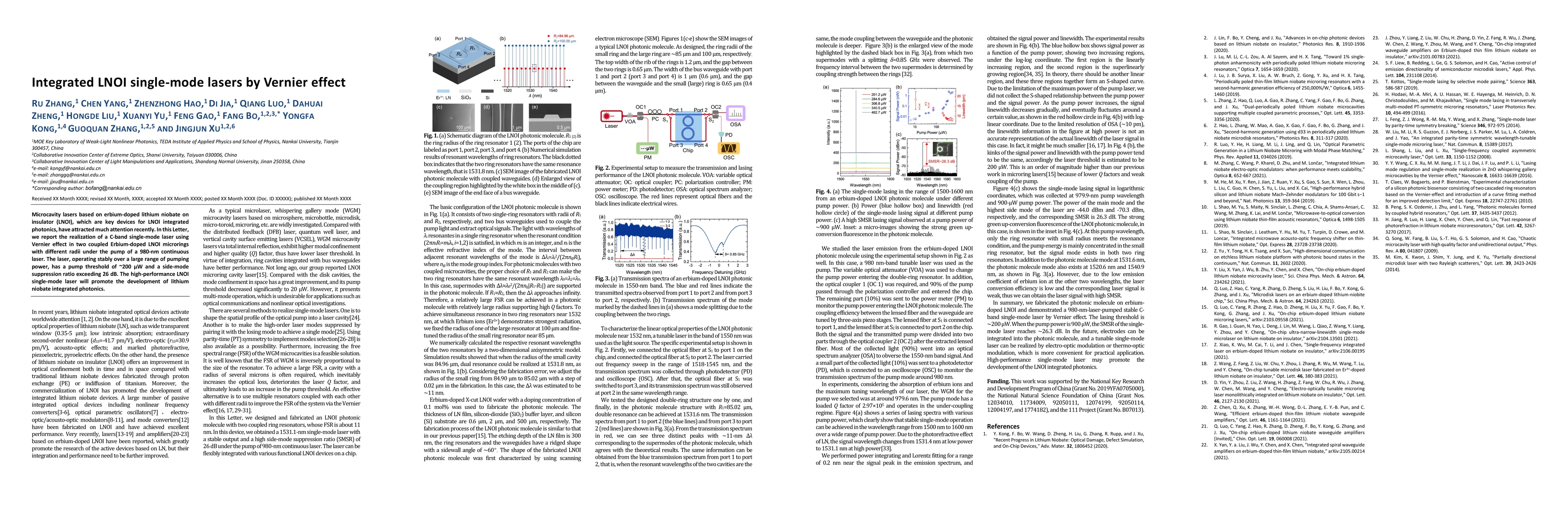 This paper presents a C-band single-mode laser based on erbium-doped LNOI microrings using the Vernier effect, achieving stable operation with a low pump threshold of ~200 μW and high side-mode suppression ratio exceeding 26 dB, advancing the field of lithium niobate integrated photonics.