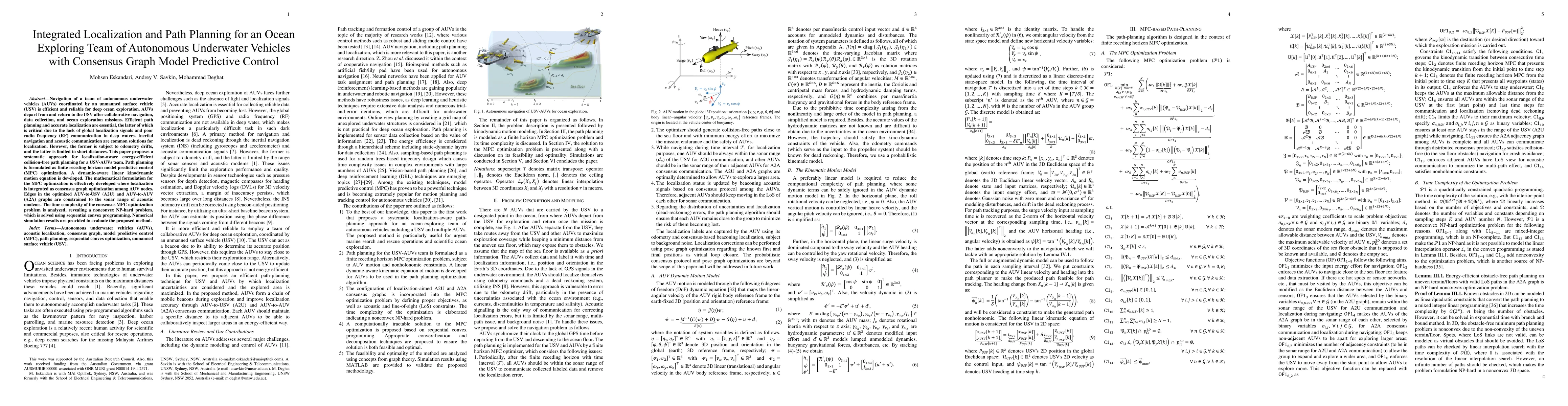 This paper proposes a systematic approach for efficient path planning and accurate localization of a team of autonomous underwater vehicles in deep ocean exploration, using consensus graph model predictive control to optimize energy-efficient collision-free navigation.