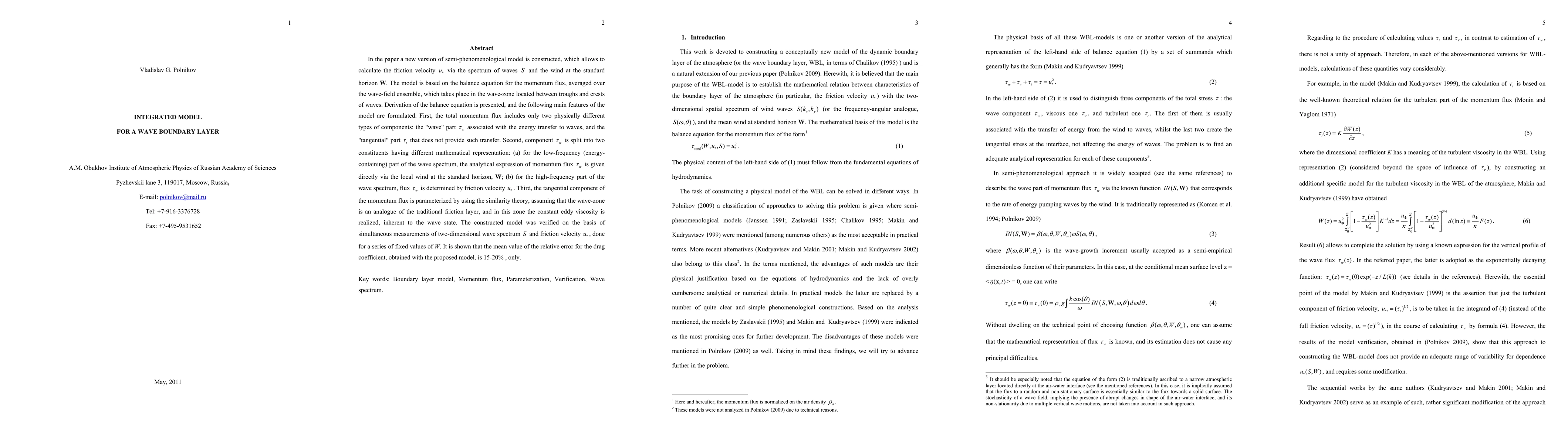 In the paper a new version of semi-phenomenological model is constructed, which allows to calculate the friction velocity u* via the spectrum of waves S and the wind at the standard horizon W. The model is based on the balance equation for the momentum flux, averaged over the wave-field ensemble, which takes place in the wave-zone located between troughs and crests of waves. Derivation of the balance equation is presented, and the following main features of the model are formulated. First, the total momentum flux includes only two physically different types of components: the "wave" part TAUw associated with the energy transfer to waves, and the "tangential" part TAUt that does not provide such transfer. Second, component TAUw is split into two constituents having different mathematical representation: (a) for the low-frequency (energy-containing) part of the wave spectrum, the analytical expression of momentum flux TAUw is given directly via the local wind at the standard horizon, W; (b) for the high-frequency part of the wave spectrum, flux TAUw is determined by friction velocity u*. Third, the tangential component of the momentum flux TAUt is parameterized by using the similarity theory, assuming that the wave-zone is an analogue of the traditional friction layer, and in this zone the constant eddy viscosity is realized, inherent to the wave state. The constructed model was verified on the basis of simultaneous measurements of two-dimensional wave spectrum S and friction velocity u*, done for a series of fixed values of W. It is shown that the mean value of the relative error for the drag coefficient, obtained with the proposed model, is 15-20%, only.