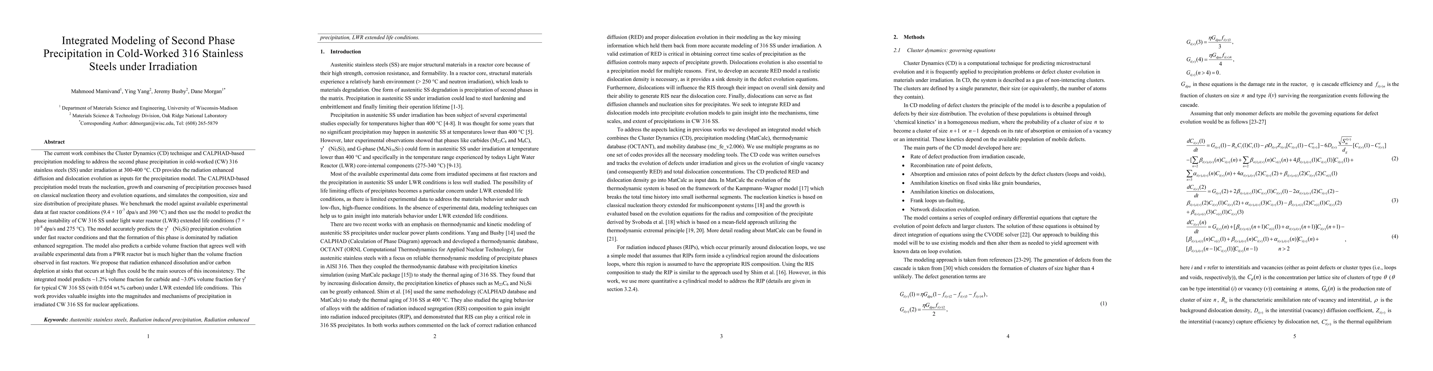 The current work combines the Cluster Dynamics (CD) technique and CALPHAD-based precipitation modeling to address the second phase precipitation in cold-worked (CW) 316 stainless steels (SS) under irradiation at 300-400 C. CD provides the radiation enhanced diffusion and dislocation evolution as inputs for the precipitation model. The CALPHAD-based precipitation model treats the nucleation, growth and coarsening of precipitation processes based on classical nucleation theory and evolution equations, and simulates the composition, size and size distribution of precipitate phases. We benchmark the model against available experimental data at fast reactor conditions (9.4 x 10^-7 dpa/s and 390 C) and then use the model to predict the phase instability of CW 316 SS under light water reactor (LWR) extended life conditions (7 x 10^-8 dpa/s and 275 C). The model accurately predicts the gamma-prime (Ni3Si) precipitation evolution under fast reactor conditions and that the formation of this phase is dominated by radiation enhanced segregation. The model also predicts a carbide volume fraction that agrees well with available experimental data from a PWR reactor but is much higher than the volume fraction observed in fast reactors. We propose that radiation enhanced dissolution and/or carbon depletion at sinks that occurs at high flux could be the main sources of this inconsistency. The integrated model predicts ~1.2% volume fraction for carbide and ~3.0% volume fraction for gamma-prime for typical CW 316 SS (with 0.054 wt.% carbon) under LWR extended life conditions. This work provides valuable insights into the magnitudes and mechanisms of precipitation in irradiated CW 316 SS for nuclear applications.