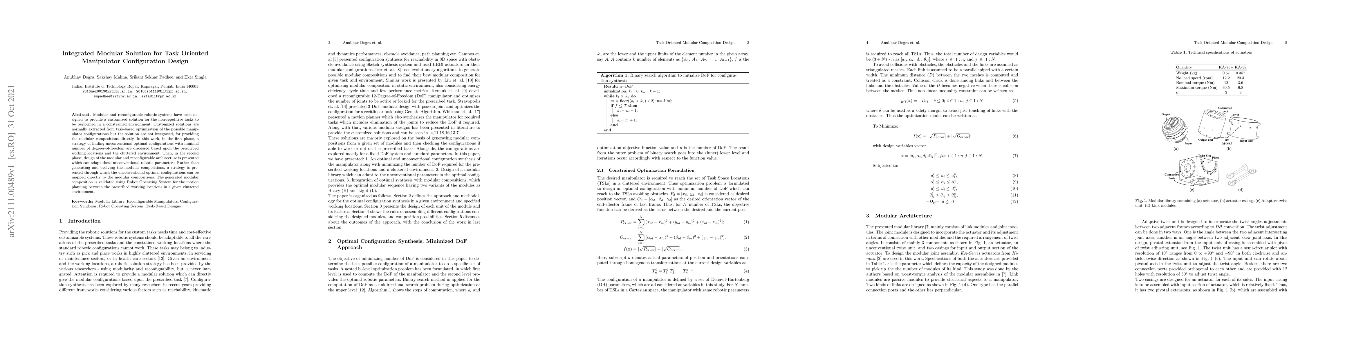 This paper proposes an integrated modular solution for task-oriented manipulators, optimizing configurations based on working locations and cluttered environments. It then presents a reconfigurable architecture that directly maps optimal configurations to modular compositions, validated through motion planning in a simulated environment.