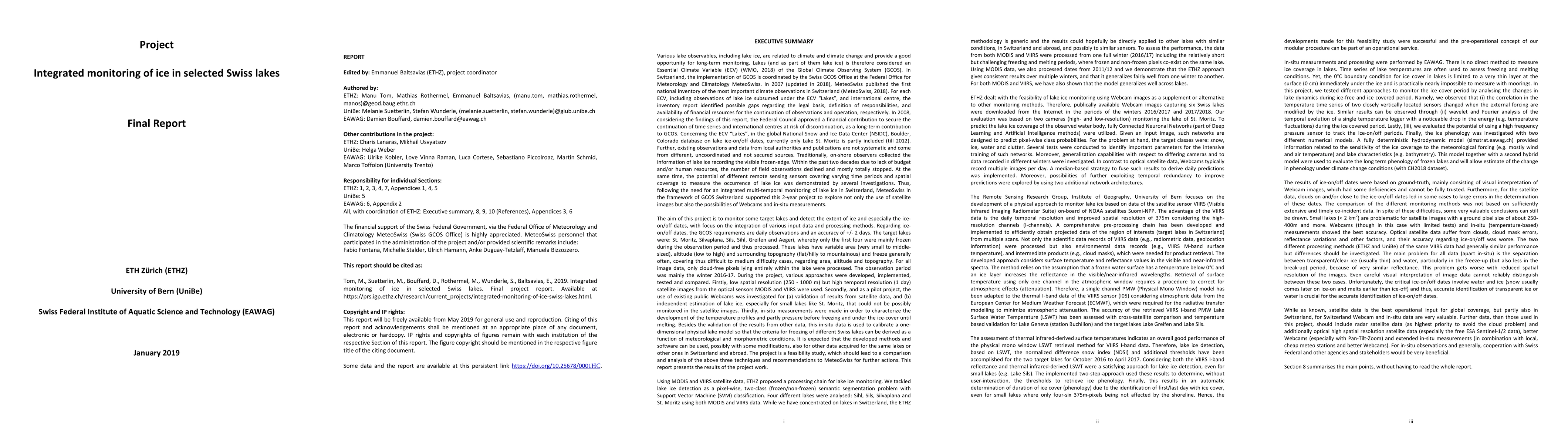 Various lake observables, including lake ice, are related to climate and climate change and provide a good opportunity for long-term monitoring. Lakes (and as part of them lake ice) is therefore considered an Essential Climate Variable (ECV) of the Global Climate Observing System (GCOS). Following the need for an integrated multi-temporal monitoring of lake ice in Switzerland, MeteoSwiss in the framework of GCOS Switzerland supported this 2-year project to explore not only the use of satellite images but also the possibilities of Webcams and in-situ measurements. The aim of this project is to monitor some target lakes and detect the extent of ice and especially the ice-on/off dates, with focus on the integration of various input data and processing methods. The target lakes are: St. Moritz, Silvaplana, Sils, Sihl, Greifen and Aegeri, whereby only the first four were mainly frozen during the observation period and thus processed. The observation period was mainly the winter 2016-17. During the project, various approaches were developed, implemented, tested and compared. Firstly, low spatial resolution (250 - 1000 m) but high temporal resolution (1 day) satellite images from the optical sensors MODIS and VIIRS were used. Secondly, and as a pilot project, the use of existing public Webcams was investigated for (a) validation of results from satellite data, and (b) independent estimation of lake ice, especially for small lakes like St. Moritz, that could not be possibly monitored in the satellite images. Thirdly, in-situ measurements were made in order to characterize the development of the temperature profiles and partly pressure before freezing and under the ice-cover until melting. This report presents the results of the project work.