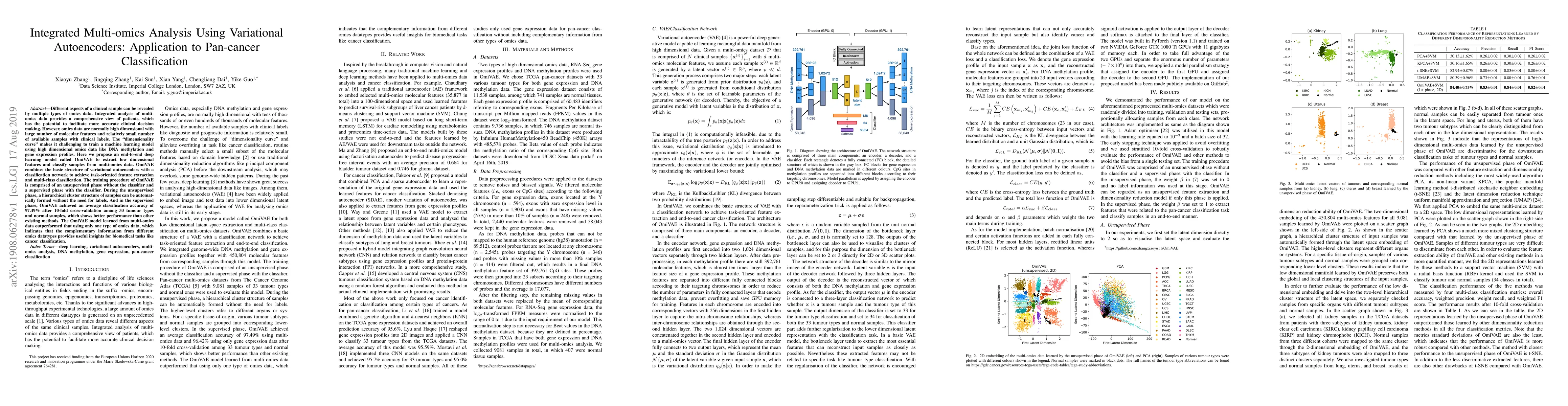 This paper proposes OmiVAE, a deep learning model combining variational autoencoders and classification networks for integrated multi-omics data analysis. It achieves high classification accuracy (97.49%) in pan-cancer classification, demonstrating the value of complementary information from different omics datatypes.