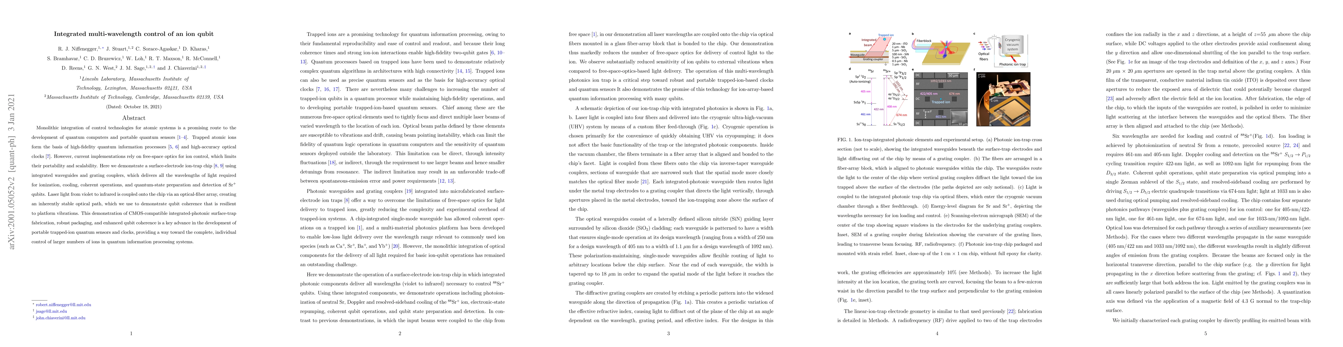 The paper presents a monolithically integrated photonic system for controlling trapped-ion qubits, utilizing waveguides and grating couplers for delivering multiple wavelengths required for ion manipulation.
