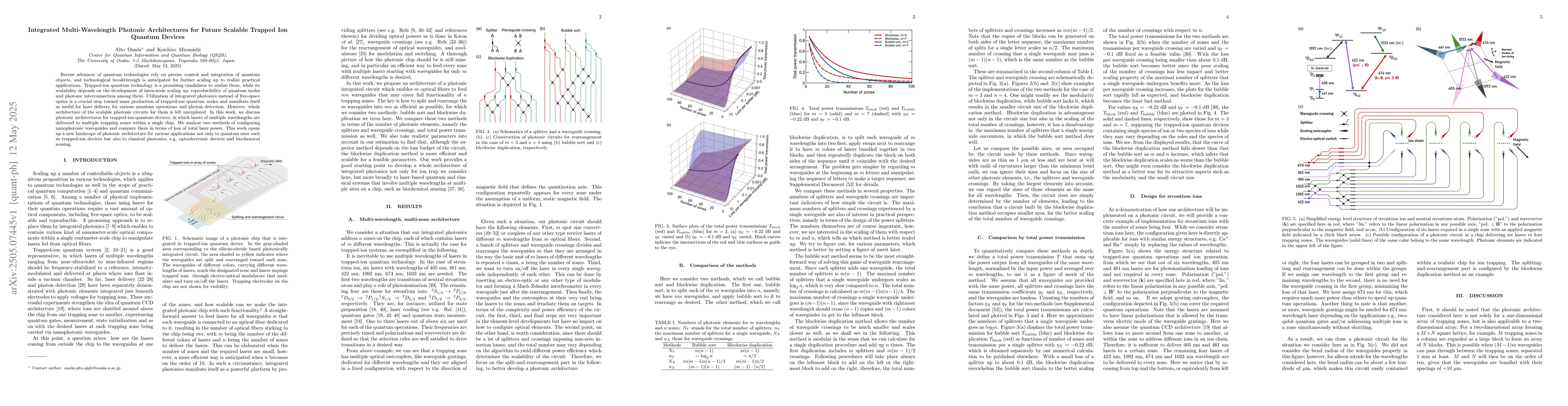 The paper discusses photonic architectures for trapped-ion quantum devices, analyzing two methods of configuring nanophotonic waveguides and comparing them based on total laser power loss.