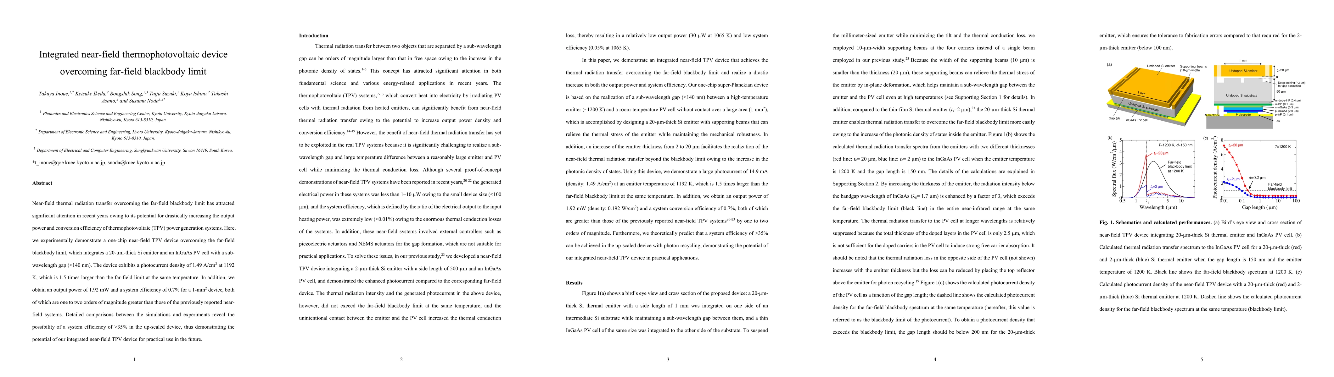 Near-field thermal radiation transfer overcoming the far-field blackbody limit has attracted significant attention in recent years owing to its potential for drastically increasing the output power and conversion efficiency of thermophotovoltaic (TPV) power generation systems. Here, we experimentally demonstrate a one-chip near-field TPV device overcoming the far-field blackbody limit, which integrates a 20-um-thick Si emitter and an InGaAs PV cell with a sub-wavelength gap (<140 nm). The device exhibits a photocurrent density of 1.49 A/cm2 at 1192 K, which is 1.5 times larger than the far-field limit at the same temperature. In addition, we obtain an output power of 1.92 mW and a system efficiency of 0.7% for a 1-mm2 device, both of which are one to two orders of magnitude greater than those of the previously reported near-field systems. Detailed comparisons between the simulations and experiments reveal the possibility of a system efficiency of >35% in the up-scaled device, thus demonstrating the potential of our integrated near-field TPV device for practical use in the future.