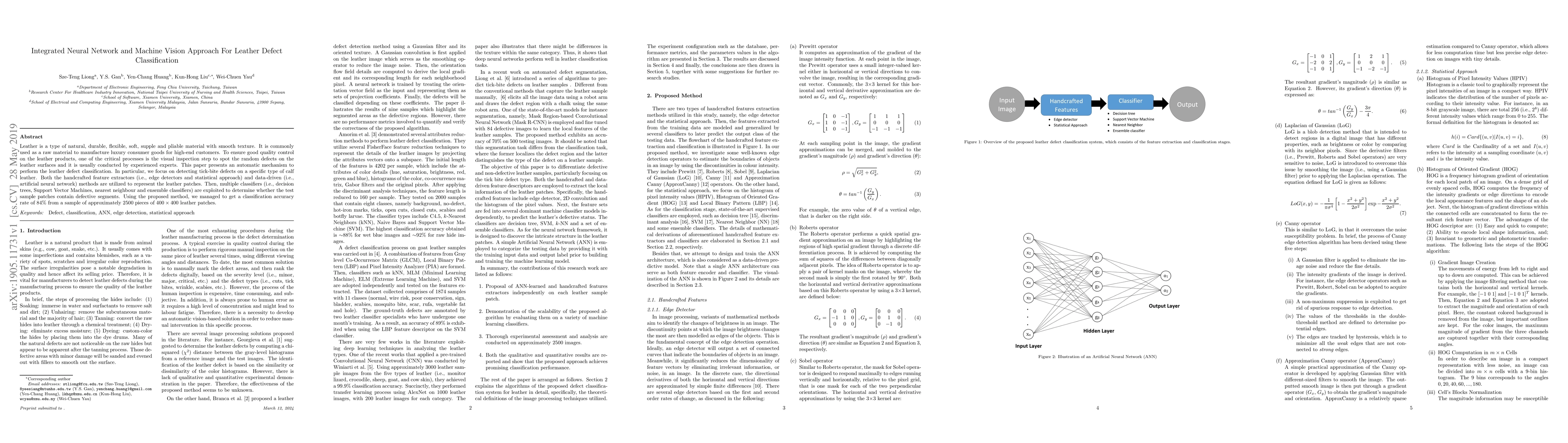 This paper proposes an integrated neural network and machine vision approach for classifying tick-bite defects in calf leather. It combines handcrafted feature extractors and artificial neural networks, followed by multiple classifiers to achieve an 84% accuracy rate on a dataset of 2500 leather patches.