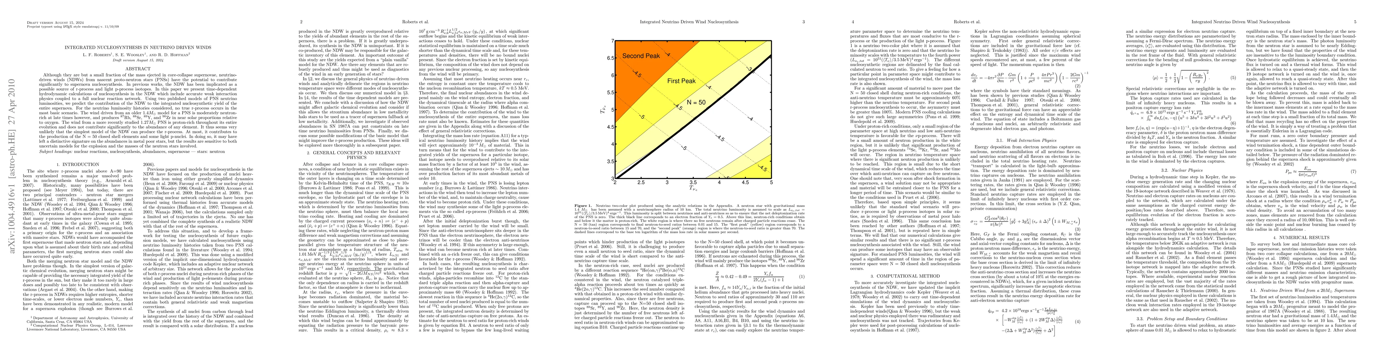 Although they are but a small fraction of the mass ejected in core-collapse supernovae, neutrino-driven winds (NDWs) from nascent proto-neutron stars (PNSs) have the potential to contribute significantly to supernova nucleosynthesis. In previous works, the NDW has been implicated as a possible source of r-process and light p-process isotopes. In this paper we present time-dependent hydrodynamic calculations of nucleosynthesis in the NDW which include accurate weak interaction physics coupled to a full nuclear reaction network. Using two published models of PNS neutrino luminosities, we predict the contribution of the NDW to the integrated nucleosynthetic yield of the entire supernova. For the neutrino luminosity histories considered, no true r-process occurs in the most basic scenario. The wind driven from an older $1.4 M_\odot$ model for a PNS is moderately neutron-rich at late times however, and produces $^{87}$Rb, $^{88}$Sr, $^{89}$Y, and $^{90}$Zr in near solar proportions relative to oxygen. The wind from a more recently studied $1.27 M_\odot$ PNS is proton-rich throughout its entire evolution and does not contribute significantly to the abundance of any element. It thus seems very unlikely that the simplest model of the NDW can produce the r-process. At most, it contributes to the production of the N = 50 closed shell elements and some light p-nuclei. In doing so, it may have left a distinctive signature on the abundances in metal poor stars, but the results are sensitive to both uncertain models for the explosion and the masses of the neutron stars involved.