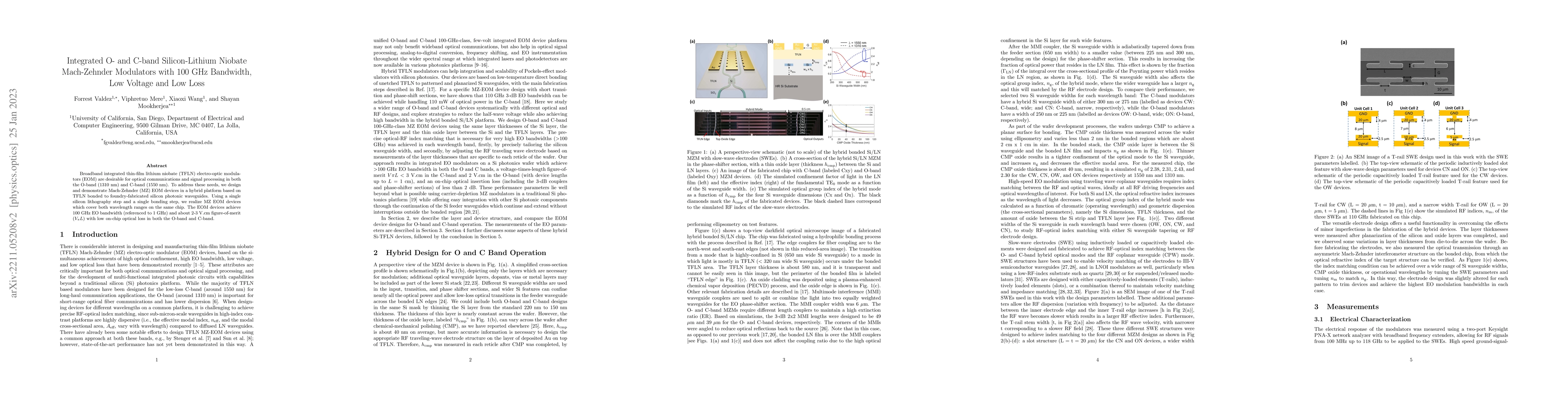 This paper presents the design and demonstration of broadband integrated thin-film lithium niobate (TFLN) Mach-Zehnder modulators that operate efficiently in both the O-band and C-band with 100 GHz bandwidth, low voltage, and minimal optical loss. The modulators are fabricated on a hybrid silicon photonic platform, achieving a low figure-of-merit and single-step fabrication.