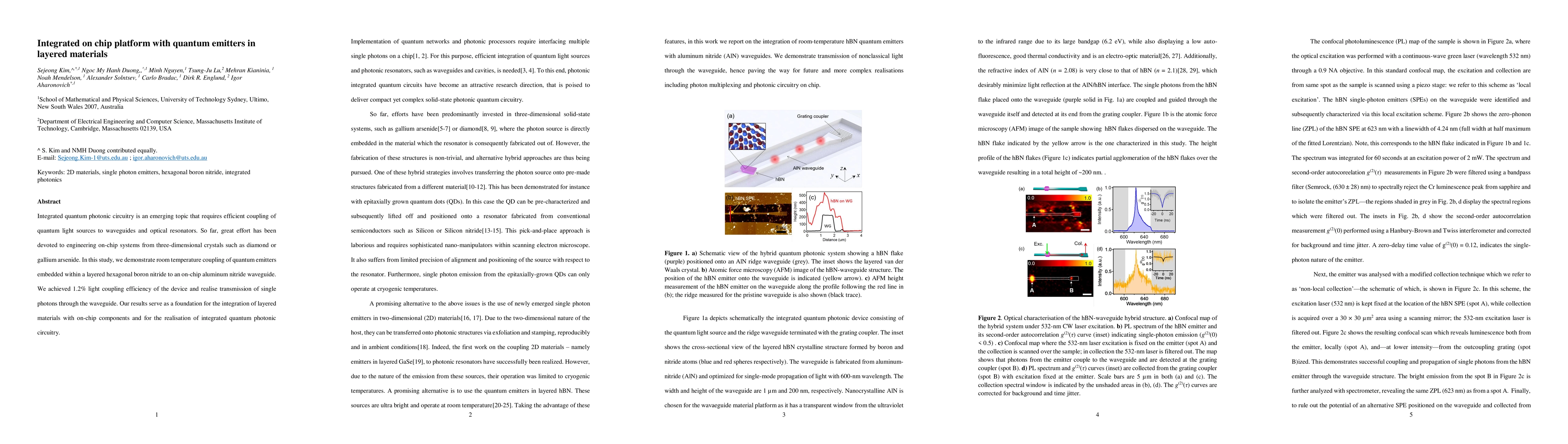 Integrated quantum photonic circuitry is an emerging topic that requires efficient coupling of quantum light sources to waveguides and optical resonators. So far, great effort has been devoted to engineering on-chip systems from three-dimensional crystals such as diamond or gallium arsenide. In this study, we demonstrate room temperature coupling of quantum emitters embedded within a layered hexagonal boron nitride to an on-chip aluminium nitride waveguide. We achieved 1.2% light coupling efficiency of the device and realise transmission of single photons through the waveguide. Our results serve as a foundation for the integration of layered materials with on-chip components and for the realisation of integrated quantum photonic circuitry.