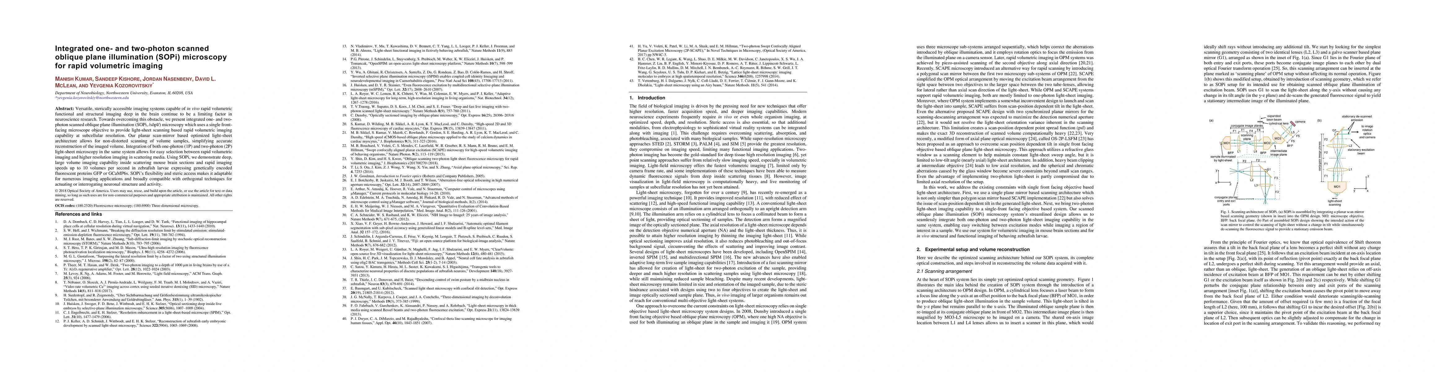 This paper introduces integrated one- and two-photon scanned oblique plane illumination (SOPi) microscopy for rapid volumetric imaging in neuroscience, enabling deep, high-resolution imaging in scattering media and achieving up to 10 volumes per second. SOPi's planar scan-mirror architecture facilitates non-distorted volumetric imaging, making it adaptable for various applications.