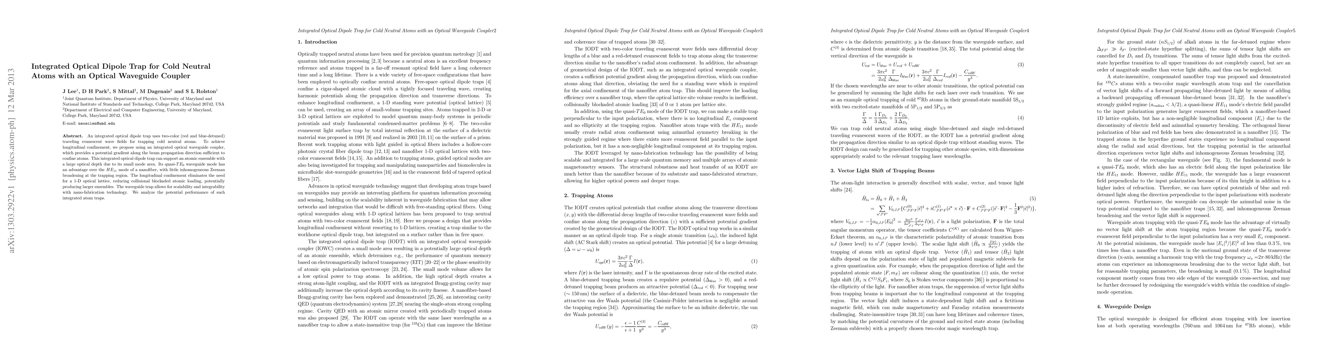 This paper proposes an integrated optical dipole trap using a waveguide coupler to trap cold neutral atoms via two-color evanescent wave fields, offering scalable and integrable atom trapping with reduced collisional effects and larger atomic ensembles. The waveguide mode provides better confinement and minimal inhomogeneous broadening compared to traditional methods.