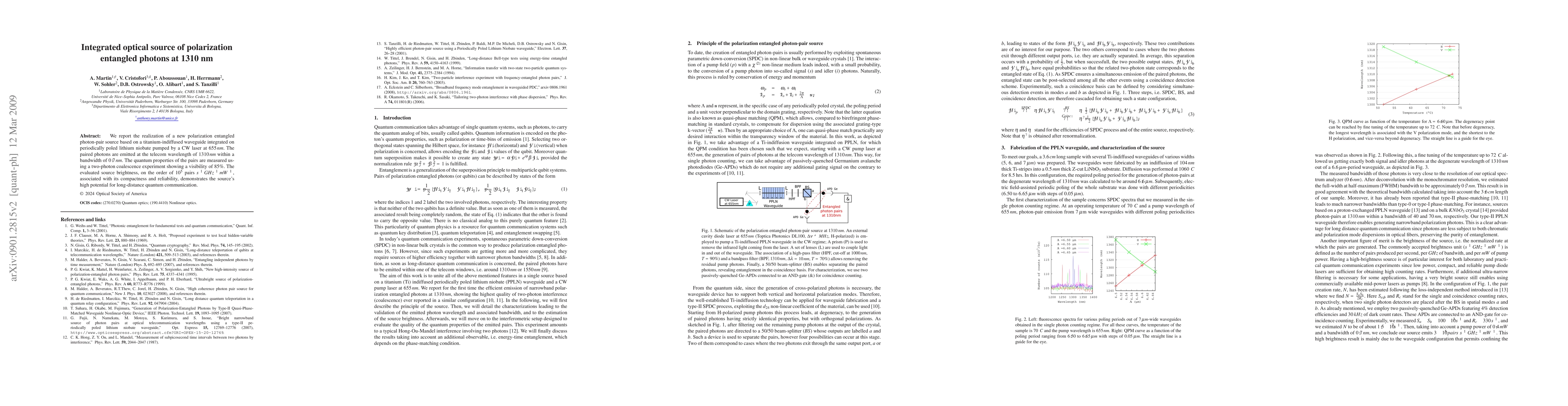 This paper presents a compact integrated optical source for generating polarization-entangled photon pairs at 1310 nm using a titanium-indiffused waveguide on periodically poled lithium niobate, achieving high source brightness and quantum visibility suitable for long-distance quantum communication.