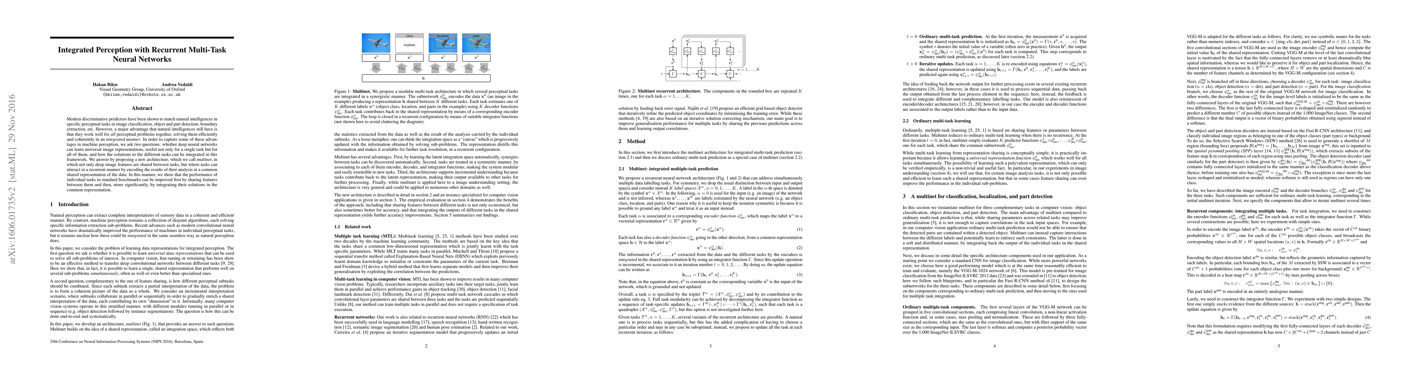 Modern discriminative predictors have been shown to match natural intelligences in specific perceptual tasks in image classification, object and part detection, boundary extraction, etc. However, a major advantage that natural intelligences still have is that they work well for "all" perceptual problems together, solving them efficiently and coherently in an "integrated manner". In order to capture some of these advantages in machine perception, we ask two questions: whether deep neural networks can learn universal image representations, useful not only for a single task but for all of them, and how the solutions to the different tasks can be integrated in this framework. We answer by proposing a new architecture, which we call "MultiNet", in which not only deep image features are shared between tasks, but where tasks can interact in a recurrent manner by encoding the results of their analysis in a common shared representation of the data. In this manner, we show that the performance of individual tasks in standard benchmarks can be improved first by sharing features between them and then, more significantly, by integrating their solutions in the common representation.