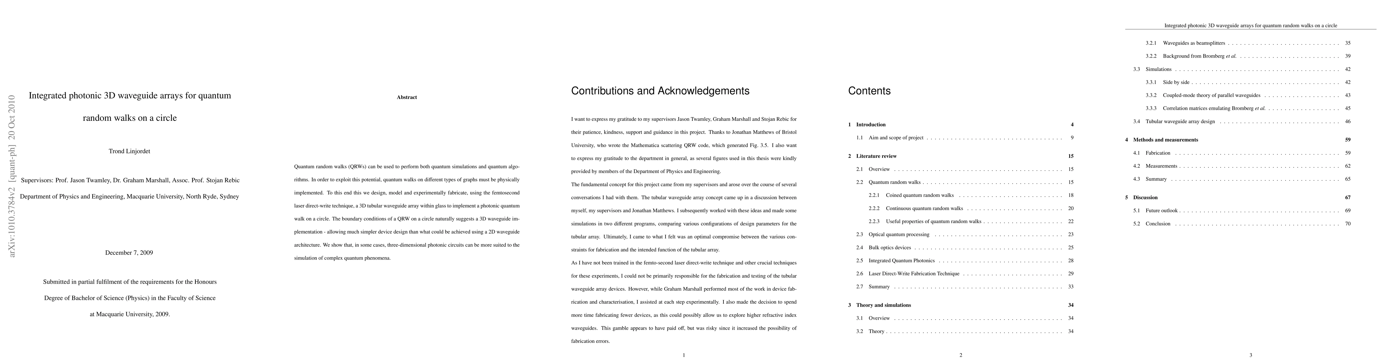 This paper designs and fabricates a 3D photonic waveguide array using femtosecond laser direct-write to implement a quantum random walk on a circle, demonstrating that 3D circuits can more effectively simulate complex quantum phenomena compared to 2D architectures. The study highlights the potential of integrated photonic waveguides for quantum simulations and algorithms.