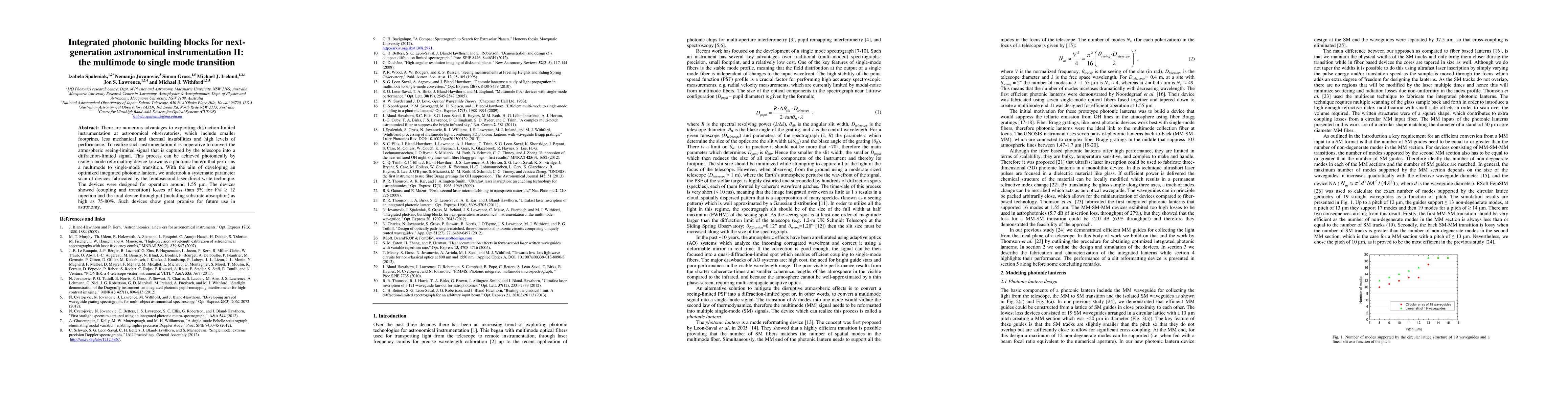 This paper explores the development of integrated photonic lanterns for converting atmospheric seeing-limited signals to diffraction-limited signals in astronomical instrumentation, achieving coupling and transition losses of less than 5% and a device throughput of 75-80%. These optimized devices hold significant potential for future astronomical applications.